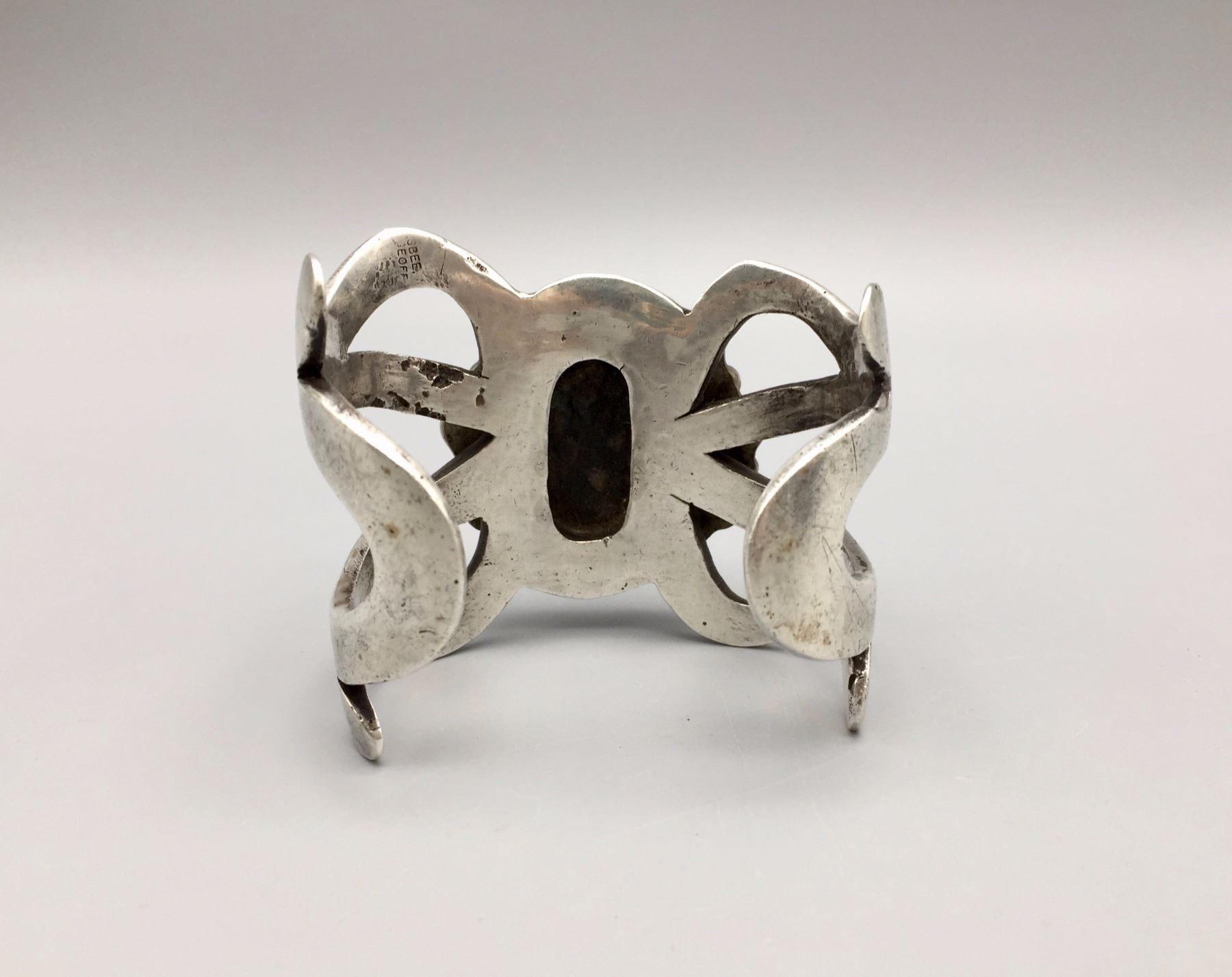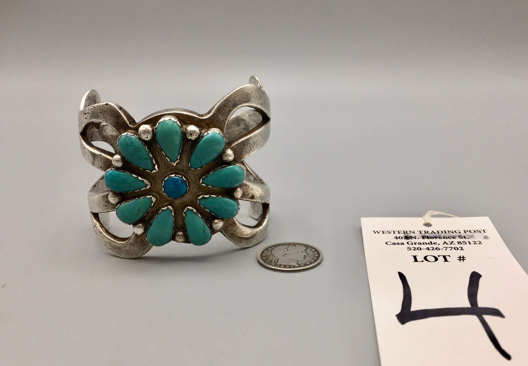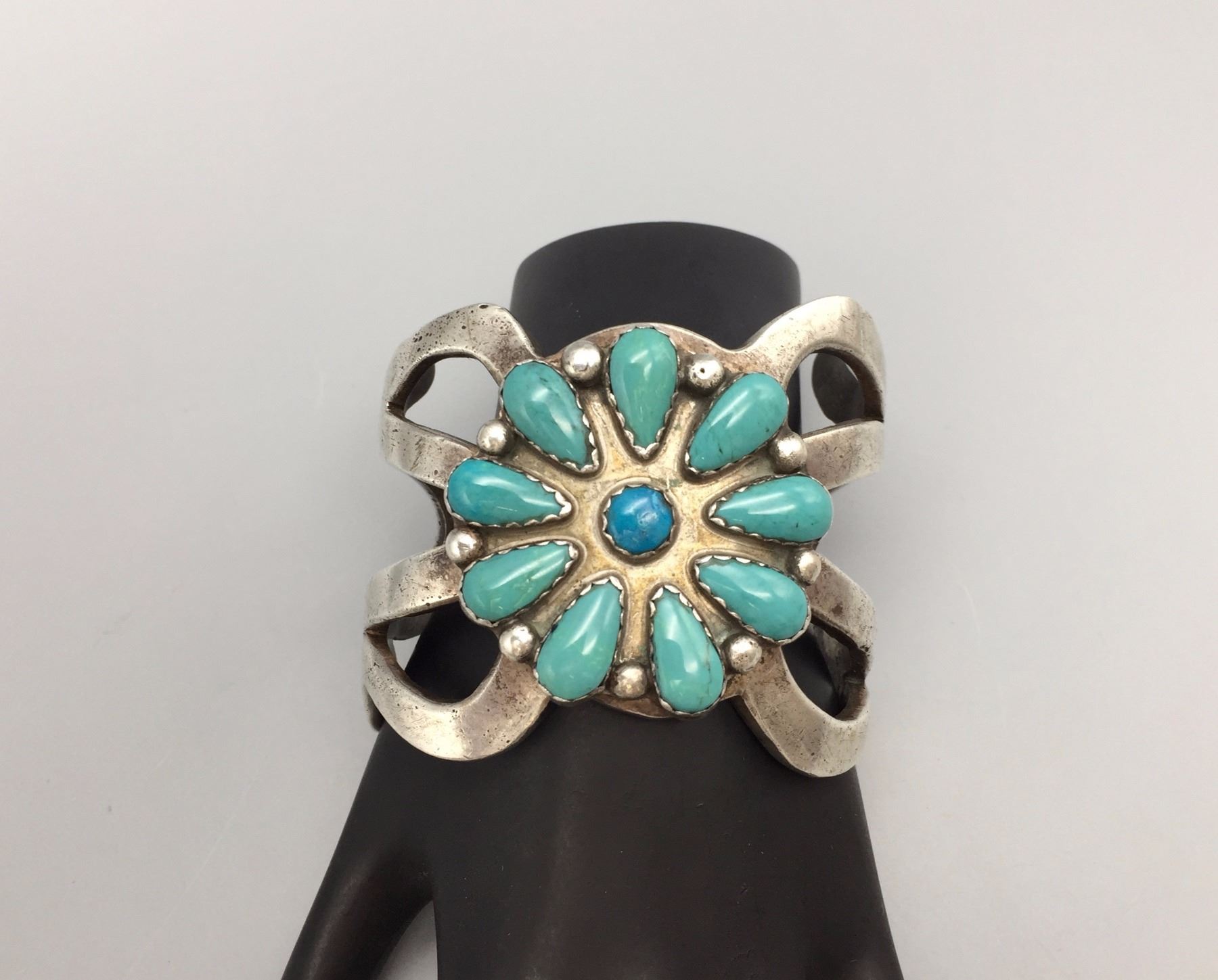 Description: Large, heavy sand cast bracelet featuring a cluster of beautiful turquoise. Maker: Unknown, has a hard-to-read hallmark. Approx. Age: Circa 1980s. Size: Inside circumference measures approx. 6" with a 1 1/8” gap (making this bracelet fit about a 7 1/8” wrist). It is 2 1/2” wide across the face and weighs 205 g. Condition: Good for its age, normal wear expected. Please look closely at the pictures - they are an important part of our description. Shipping: There will be a $5 handling / packaging fee for shipping this lot. The actual cost of postage will be added on top of that.