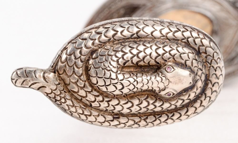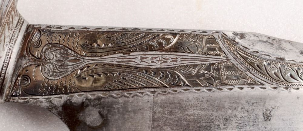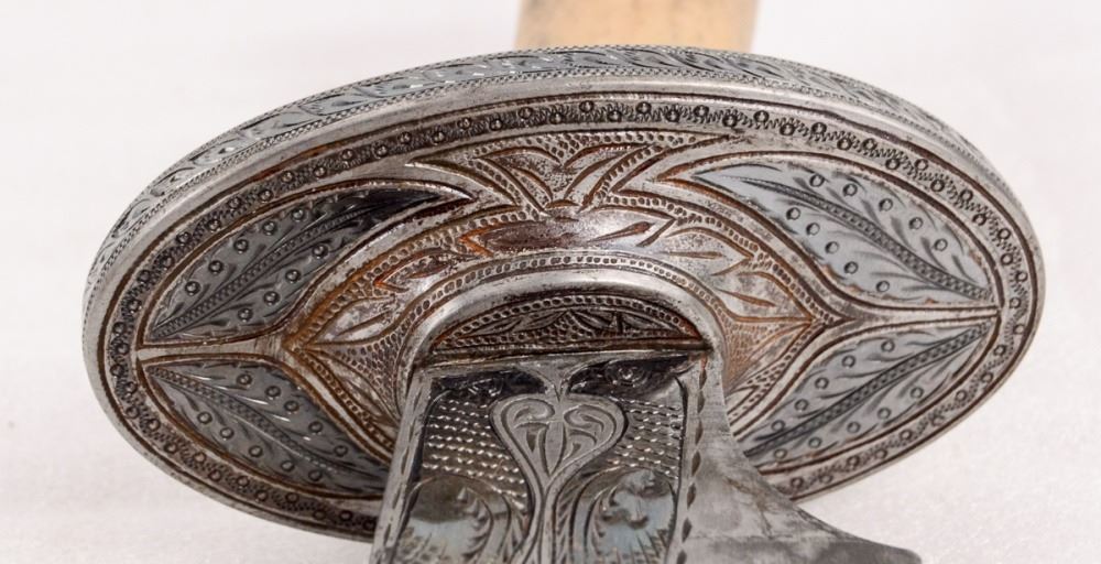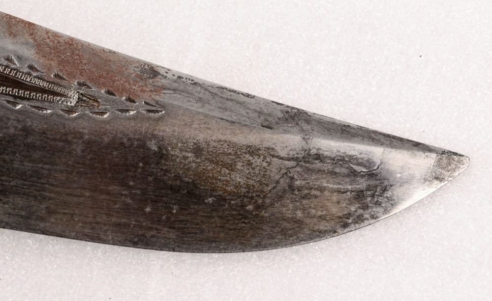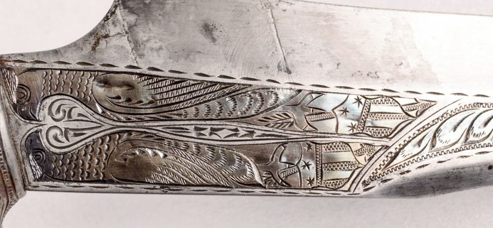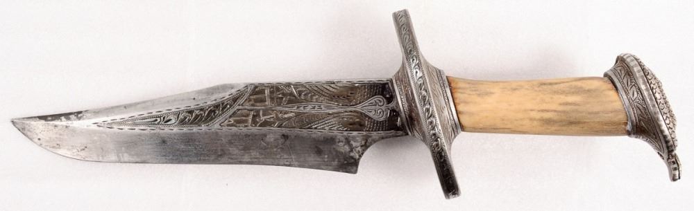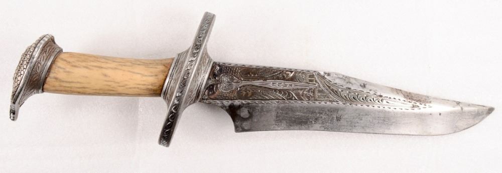 Heavily engraved and inlaid with silver, this beautiful knife has a bone grip. The pommel and guard are uniquely angled. The blade is engraved with a double eagle design. The grip is silver inlaid and engraved with a leaf design. The pommel is decorated with a coiled snake. Measures 15"L, with a 9" bowie shaped blade. The blade has some staining and a vertical line on the beveled area. See photos to truly appreciate this blade.