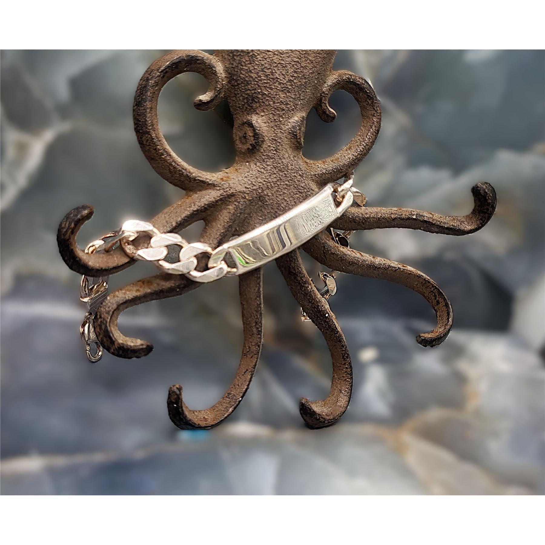 This is a sterling silver bracelet with intermittent curb links with an elongated link, as in a modified figaro design. Cast from Italian sterling silver with a curved, solid bar for engraving. The bracelet is 9" long with a lobster clasp.