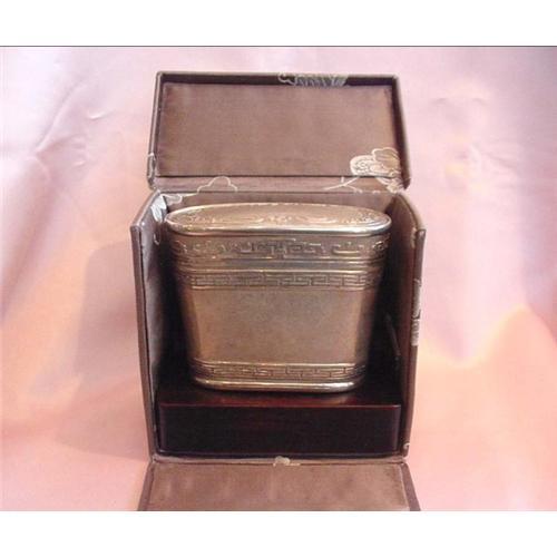 Very heavy sterling tea caddy box with original stand and box. This handsome box has a raised greek key type design on a textured or mat type surface. The original rosewood stand and lavender silk box come with this tea caddy. The sterling box itself measures 3" tall by 3 3/4" wide by 1 1/2" deep. The box measures 4 1/4" tall by 4 3/4" wide by 2 1/2" deep. This solid sterling piece weighs a hefty 1 lb.! The mark on the bottom is hard to see, but appears Chinese with the word "Sterling" beneath it. Excellent condition.