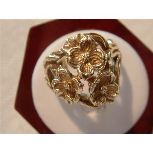 This is a very heavy 14K yellow gold ring weighing 9.5 grams. It is beautifully designed with flowers on the top and decorations on the upper part of the ring. Please note the side view of the ring and the mark. The ring is a size 7 1/4. This is a very substantial ring beautifully designed. Please view all four pictures for close-up views. I have also included a picture of the mark as well as the detailing. This ring is in excellent condition.