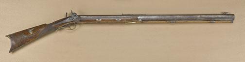 Heavy barrel half stock rifle signed “A. Baker” on back-action lock. Showing double barrel keys, heavy octagon barrel, single trigger, brass and German silver mounts, nicely checkered at wrist, peep-type rearsight, hooded front sight, nicely inlaid with German silver eagle and shield on right cheek piece, reclining stag on left cheek piece. (Note: Unusual feature in the fact that is has a right and left cheek piece).Approx. .52 caliber. 53” overall, 37” barrel, which measures approx. 1-1/4” across the flats of the barrel. The rifle remains in good to very good condition with a natural patina on the metal surface and traces of the original colors. Some light to moderate pitting and erosion. Stocks good to very good with some minor marks, stress crack, abrasions and normal aging, good checkering, and some fancy grain to the wood. Est: $900 -1800