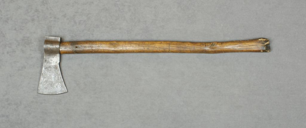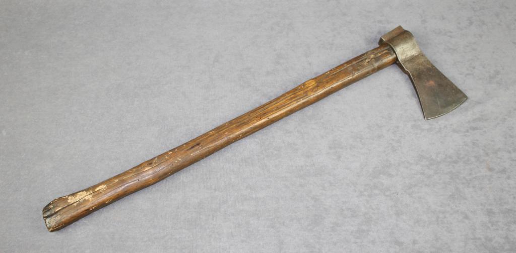 Heavy blade axe marked “Hudson Bay Co.” approx. 7” overall with old wood shaft approx. 27” overall. This classic old axe shows a dark patina on the head and considerable wear with scattered losses withworm holes. Est.: $400-$800.