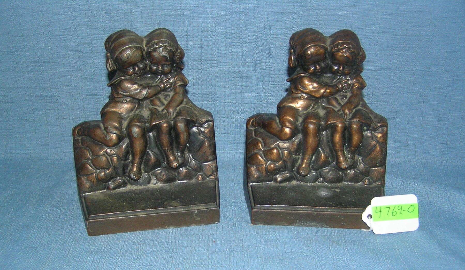Heavy cast metal Jack and Jill figural bookend signed bronze art on back est. value $200.00-$225.00