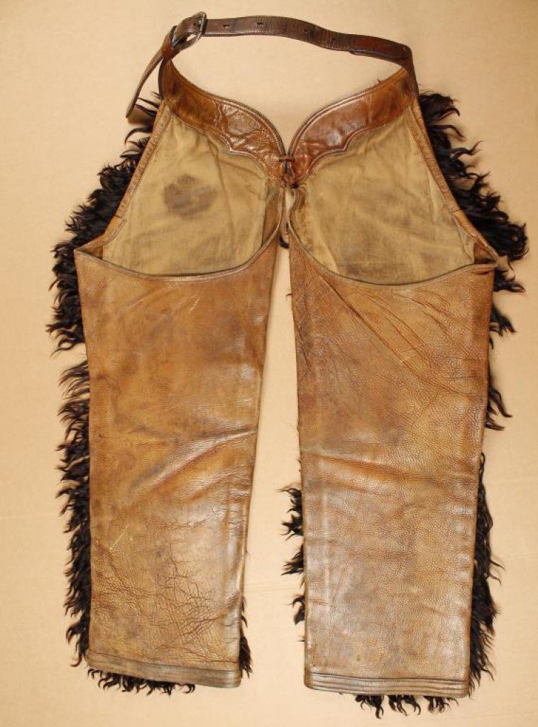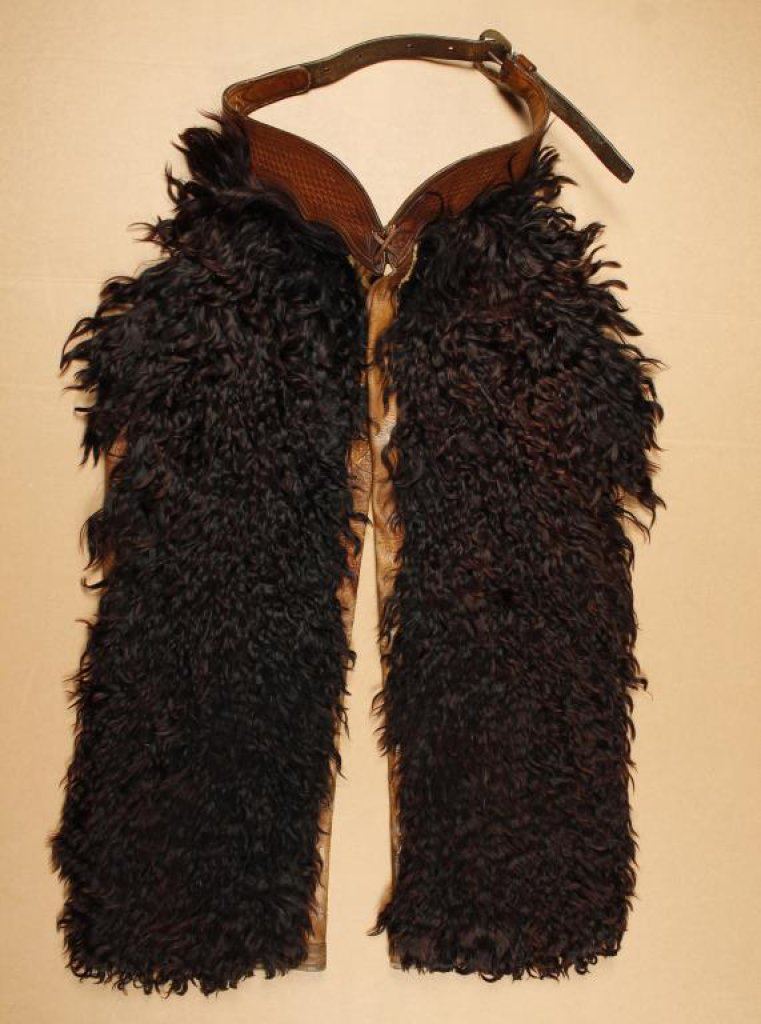 Heavy duty lined leather and Angora wooly chaps with unmarked tooled leather belt in overall very good condition. Est.: $300-$600.