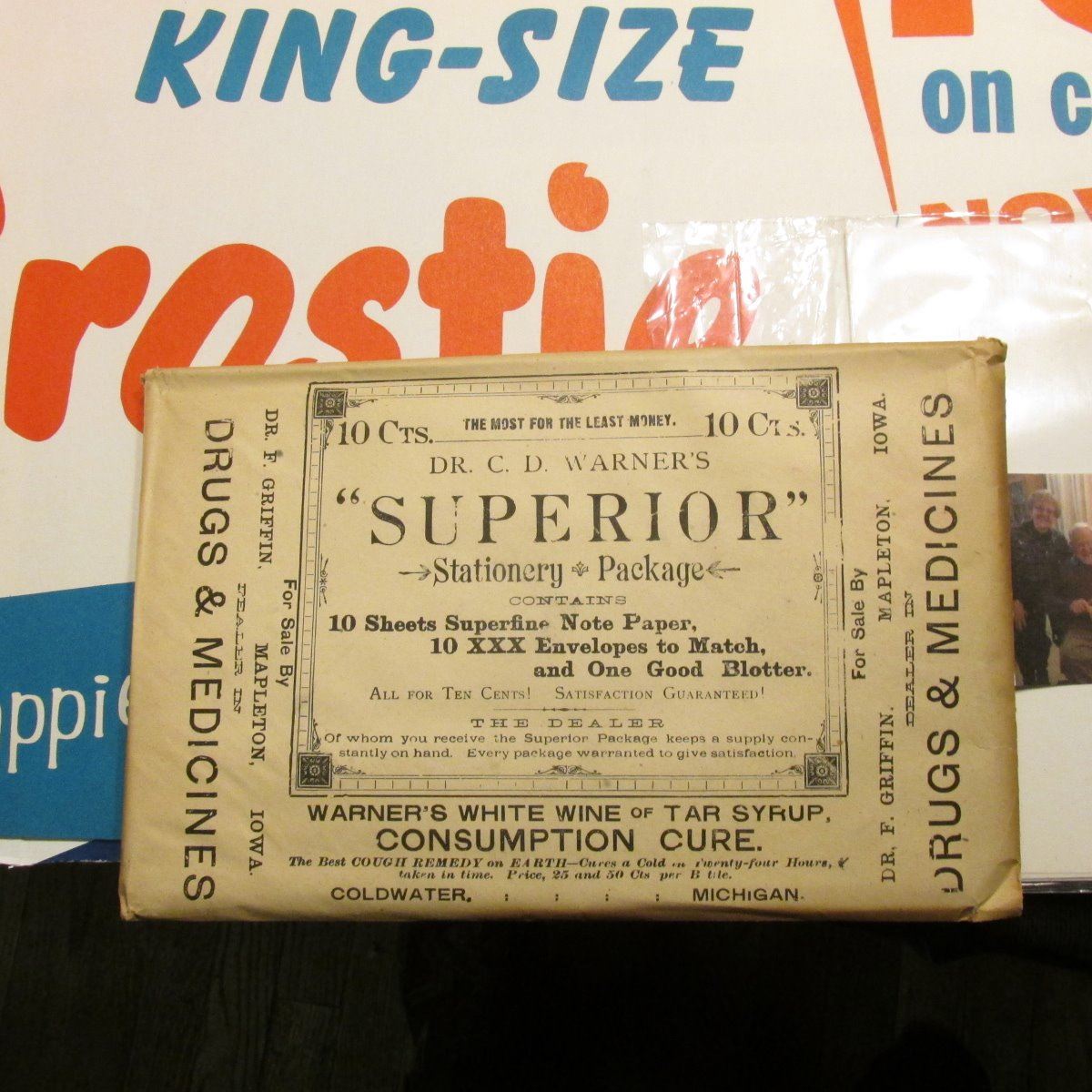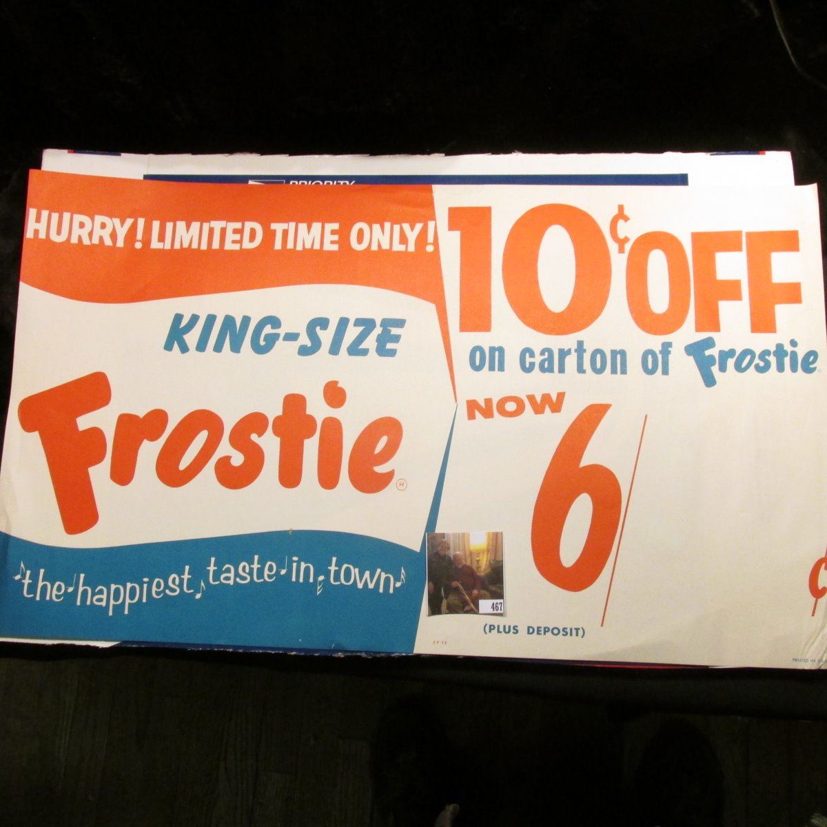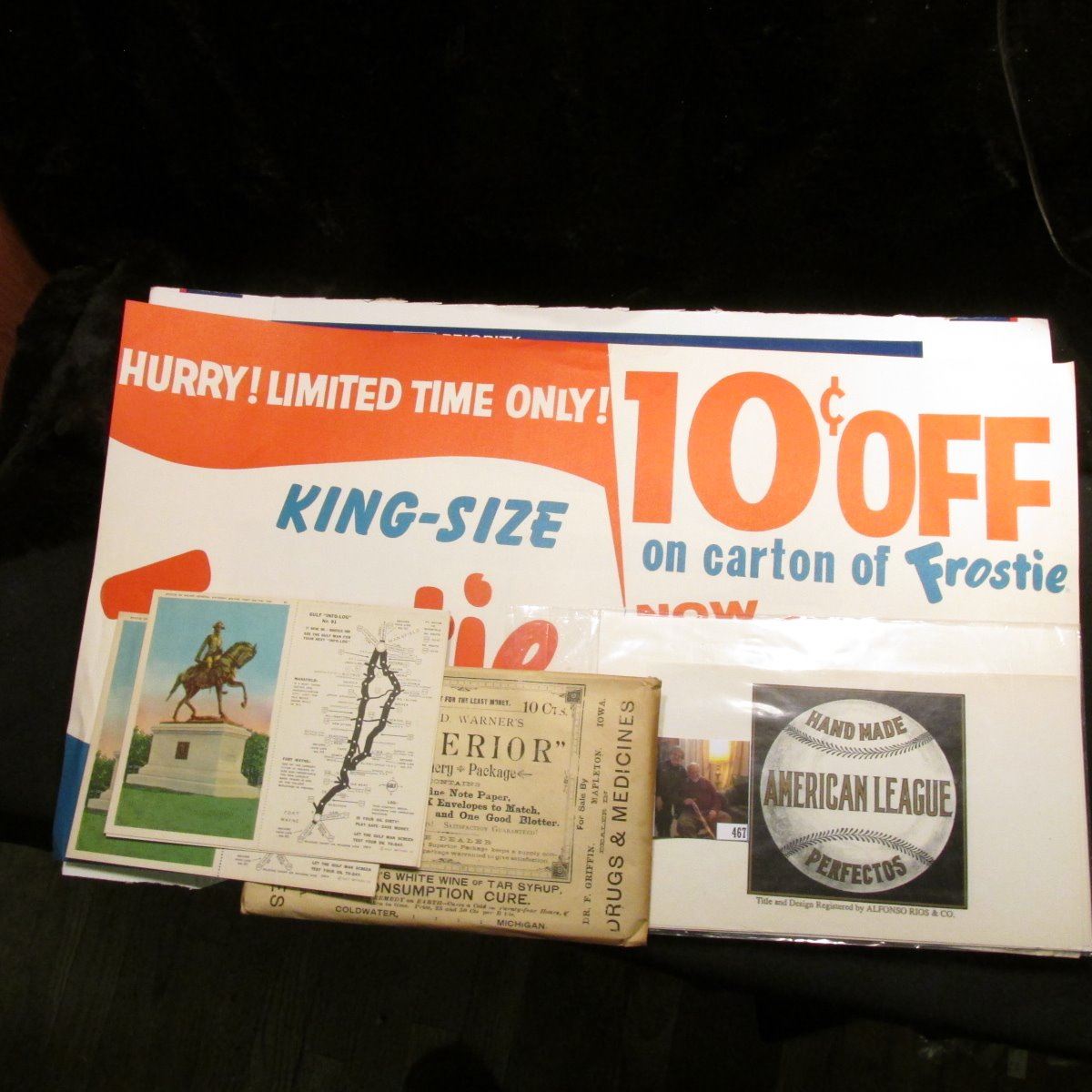 Heavy paper sign "Hurry! Limited Time Only! King-Size Frostie 10c Off on carton of Frostie Now 6 (plus Deposit) the happiest taste in town" 13" x 22"; Quack Doctor advertising Envelope containing "Dr. C.D. Warner's "Superior" Stationery Package…Warner's White Wine of Tar Syrup Consumption Cure…Coldwater, Michigan"; pair of folding postcards "Stop Where You See This Sign Gulf"; & Tobacco Box label "Handmade American League Perfectos".