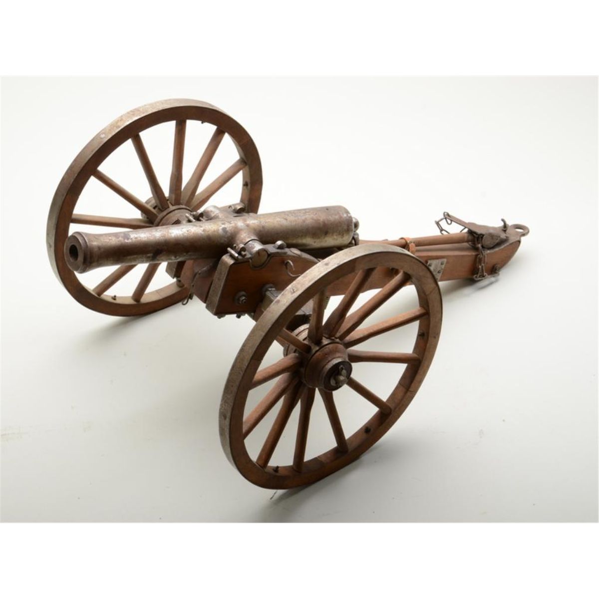 Heavy unmarked iron barrel signal cannon modeled after French fieldpiece, 28" from tip to end, tube 15-1/2" and boned about .70 to 3/4", wheels 11-1/2" in height. Nice quality metal work and especially good wheels.Probably Spanish or Italian made as model only circa 1950's to early 70's. Shows rust and patina. Est.: $300 - $600