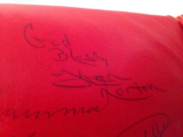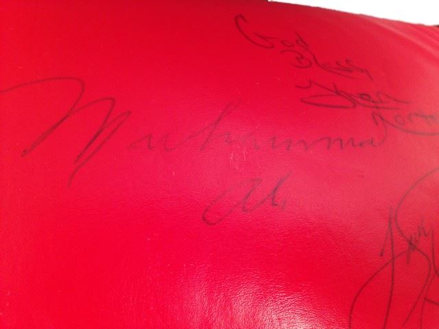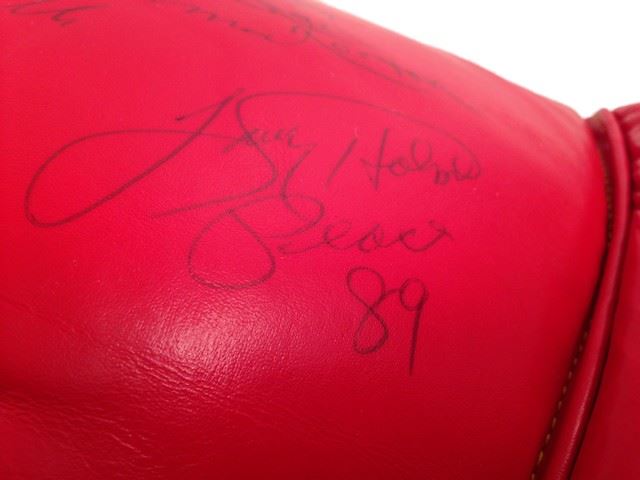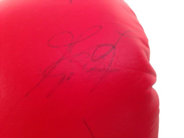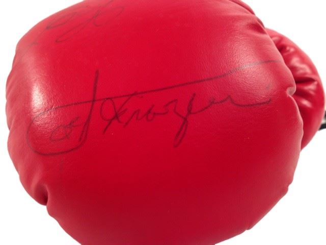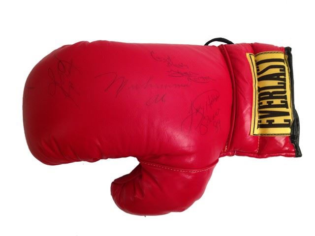 Heavyweight Champions lot of memorabilia. Includes a signed red 'Everlast' boxing glove, autographs from Muhammad Ali, Joe Frazier, Ken Norton, Larry Holmes and George Foreman. Also includes a blue 'Champions Forever' crew t-shirt with autographs printed on the front (size L), a white 'Champions Forever' crew t-shirt (size L), as well as a 'Champions Forever' VHS tape. (Glove 13"x7"x6").