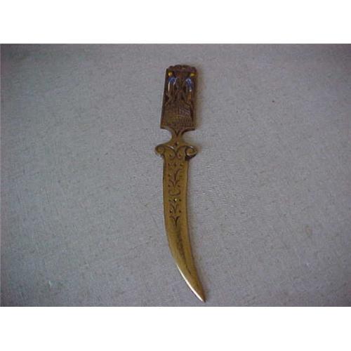 </font></strong>Hebrew Letter Opener, brass embossed with symbols, golden candlestick, 2 blue flags, yellow spears; 9" long</font>