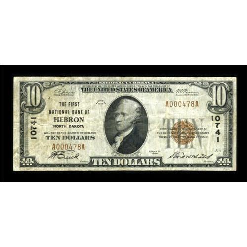 <B>Hebron, ND</B></I> - $10 1929 Ty. 1 <B>The First NB</B></I> Ch. # 10741<BR> A scarce small size note from the only bank to issue in this tiny Morton County locale. <B>Fine+.</B></I><BR><BR><b>Shipping:</b> Coins & Currency (<a target="_blank" href="http://www.heritageauctions.com/common/shipping.php">view shipping information</a>)