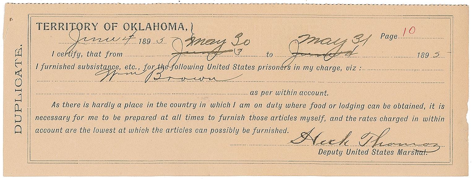 Rare partly printed DS, one page, 8 x 3, June 4, 1895. Territory of Oklahoma prisoner subsistence form, in full: "I certify, that from May 30 to May 31, 1895, I furnished subsistence, etc., for the following United States prisoners in my charge, viz: Wm. Brown, as per within account." Signed at the conclusion by Thomas as Deputy United States Marshal. In fine condition.