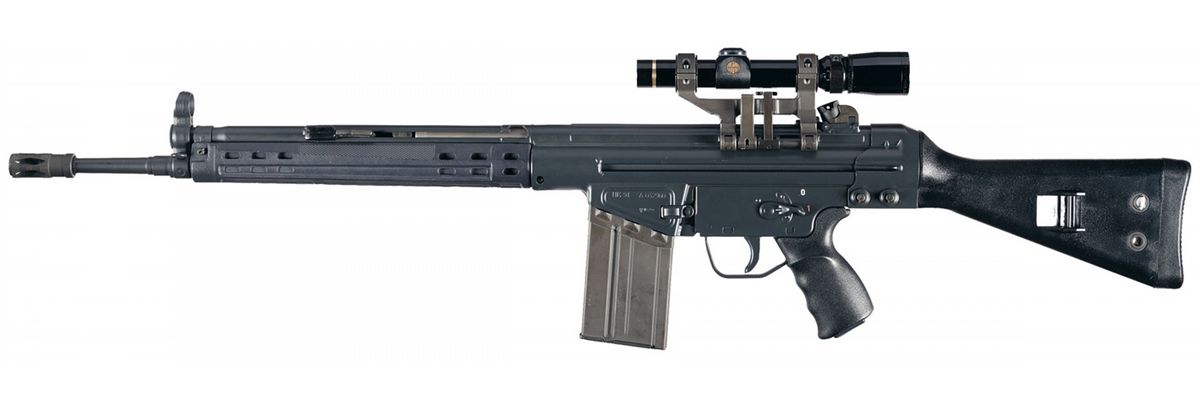 Introduced in the 1980s, this is a semi-automatic variant of the G3 Rifle. Hooded pin and rotating drum sights, with the standard markings on the magazine well and two position selector. Equipped with a Leupold 1.5x5 scope with rubber lens cover and a quick detachable mount. Fitted with a narrow forearm, smooth finger groove pistol grip, and buttstock with serrated plastic buttplate. Complete with manual and three extra mags.