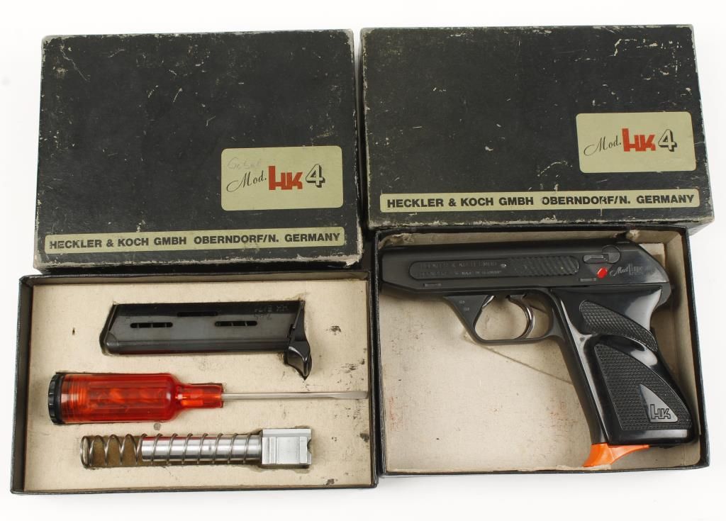 German made double action semi auto pistol wit 3" barrel. Blued finish, checkered black plastic thumb rest wrap around grips and fixed sights. Similar to the Mauser HSC. Excellent bore and action. Includes original box, 7.65mm conversion kit and magazine for each caliber. Condition: Excellent