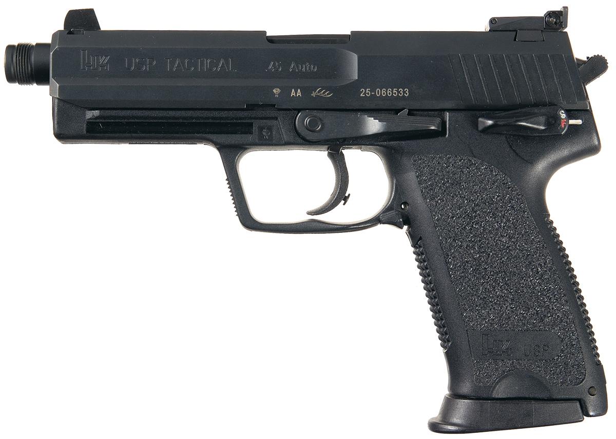 Introduced in 1998, an enhanced version of the double action USP 45. Marked "HK USP TACTICAL" "45 Auto" on the left side of slide over the serial number and proof marks. The polymer frame has an ambidextrous magazine release and the safety lever also serves as a decocking lever. Blade front and adjustable rear target sights and an accessory rail ahead of the trigger guard, the threaded barrel extends past the frame for mountable accessories and the textured grip has checkering in the grip strap areas. Comes in a gray padded H&K carrying case with extra magazine, lock, cleaning/tool kit and papers.