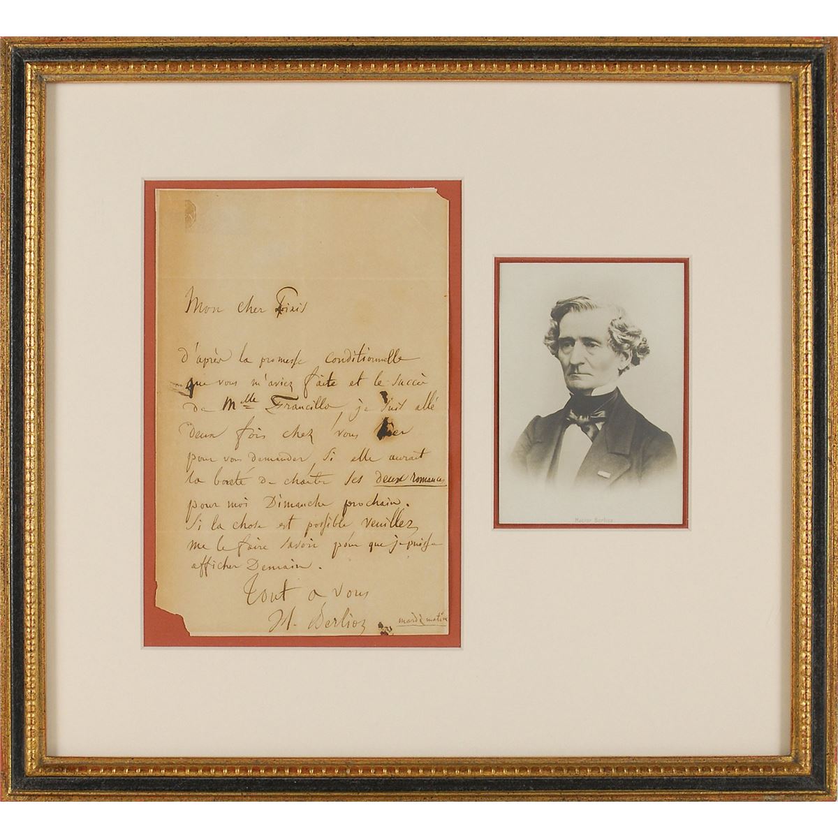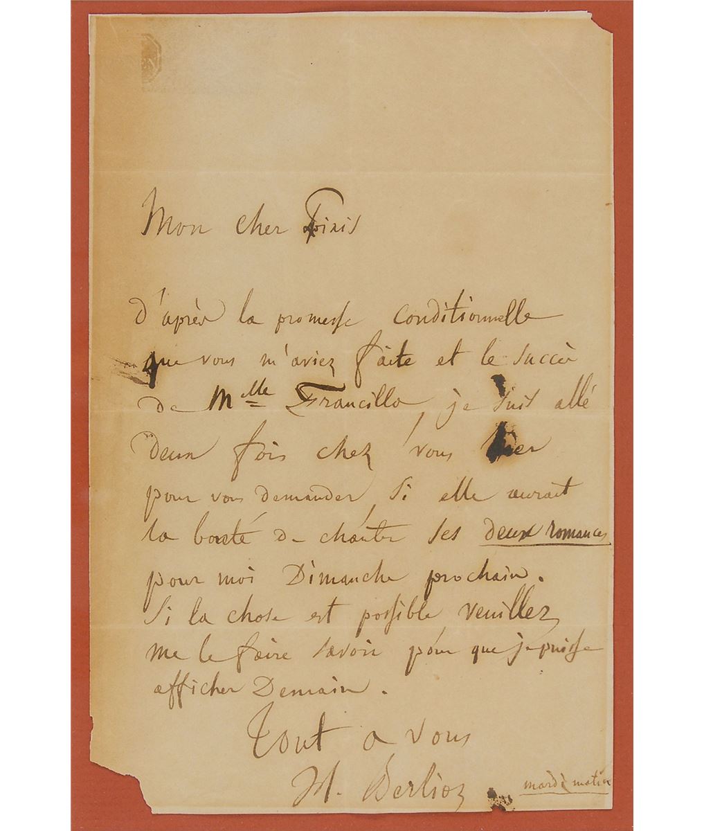 Influential French composer (1803–1869) of such repertory staples as the programmatic ‘Symphonie fantastique’ and the opera ‘Les Troyens.’ ALS in French, signed “H. Berlioz,” one page, 5.25 x 8, no date. Letter to Johann Peter Pixis, in part: “As a result of your conditional promise and Miss Francilla’s success, I went to your house twice yesterday to ask you if she would be so kind as to sing the Two Romances for me next Sunday. If this is possible, please let me know so that I may post the notice tomorrow.” Nicely double-matted and framed with a bust-length portrait of Berlioz to an overall size of 14.75 x 13.5. In very good condition, with central vertical and horizontal folds, scattered creasing and toning, paper loss to edges (upper right and bottom left corners missing), and substantial brushing to the text. The adopted daughter and protege of German composer and pianist Pixis, Francilla was so admired by Berlioz that he dedicated his orchestration of Franz Schubert’s Le Roi des Aulnes to her in 1859.