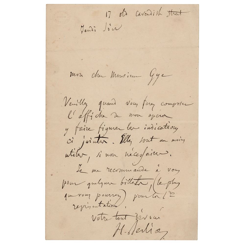 Influential French composer (1803-1869) of such repertory staples as the programmatic 'Symphonie fantastique' and the opera 'Les Troyens.' ALS in French, signed “H. Berlioz,” one page, 4.5 x 6.75, no date. Untranslated handwritten letter by Berlioz. In fine condition, with some light creasing.