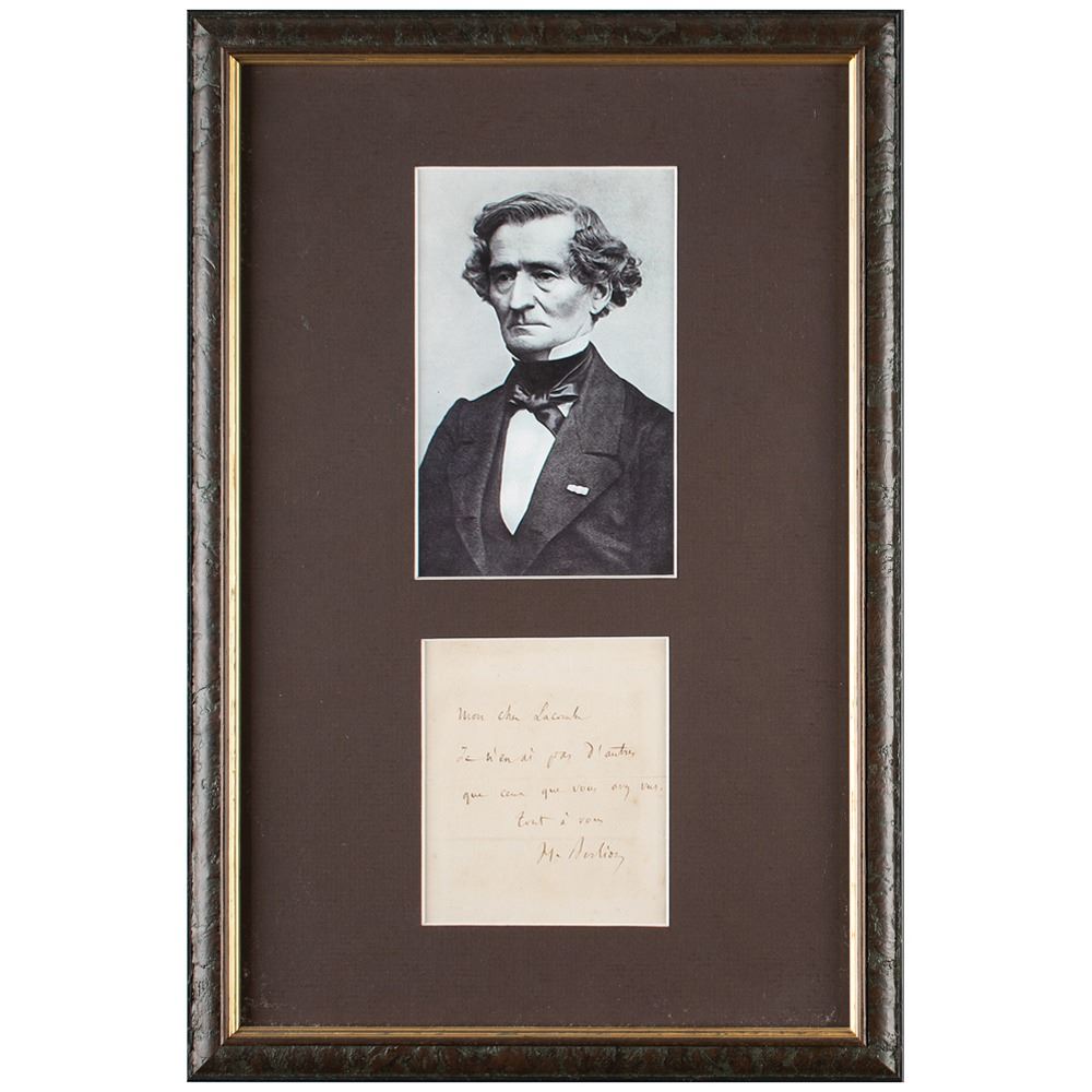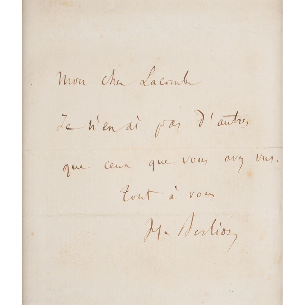 Scarce ANS in French, signed "H. Berlioz," one page, 3.5 x 4, no date. Handwritten letter to "Mon cher Lacombe," in full (translated): "I don't have any other than the one you saw." Archivally matted and framed with a portrait of the composer under Tru-Vue Conservation Clear glass to an overall size of 10.25 x 15.25. In fine condition, with light soiling and three horizontal folds.