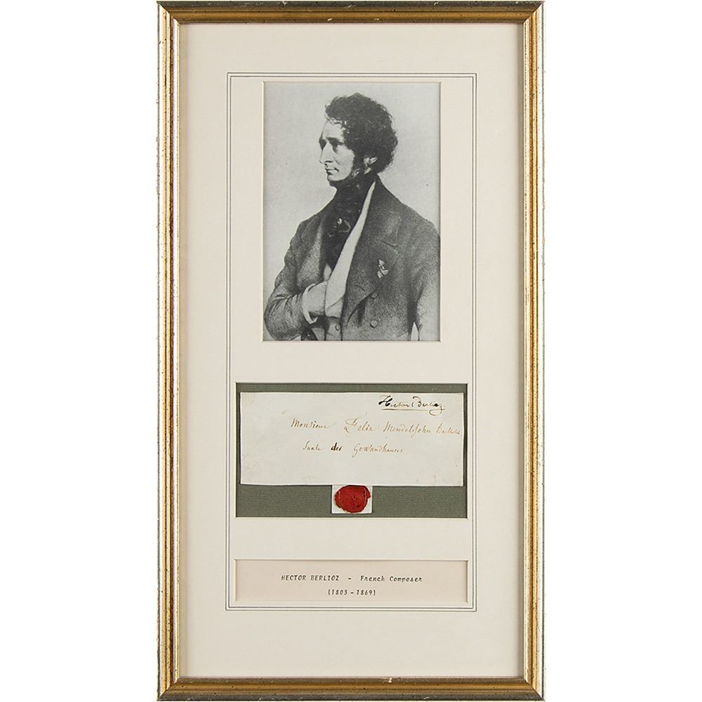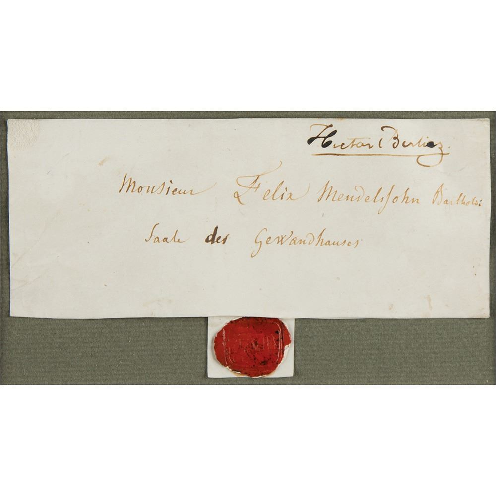 Hand-addressed mailing panel by Hector Berlioz, 5.25 x 2.25, addressed by Berlioz to "Monsieur Felix Mendelssohn Bartholdi, Saale der Gewandhauser." Identified in an unknown hand in the upper right, "Hector Berlioz." The red wax seal is affixed below. Mounted, matted, and framed with a portrait to an overall size of 9.25 x 16.75. In fine condition. Mendelssohn was serving as director of the Leipzig Gewandhaus Orchestra at the time. A fantastic association piece.