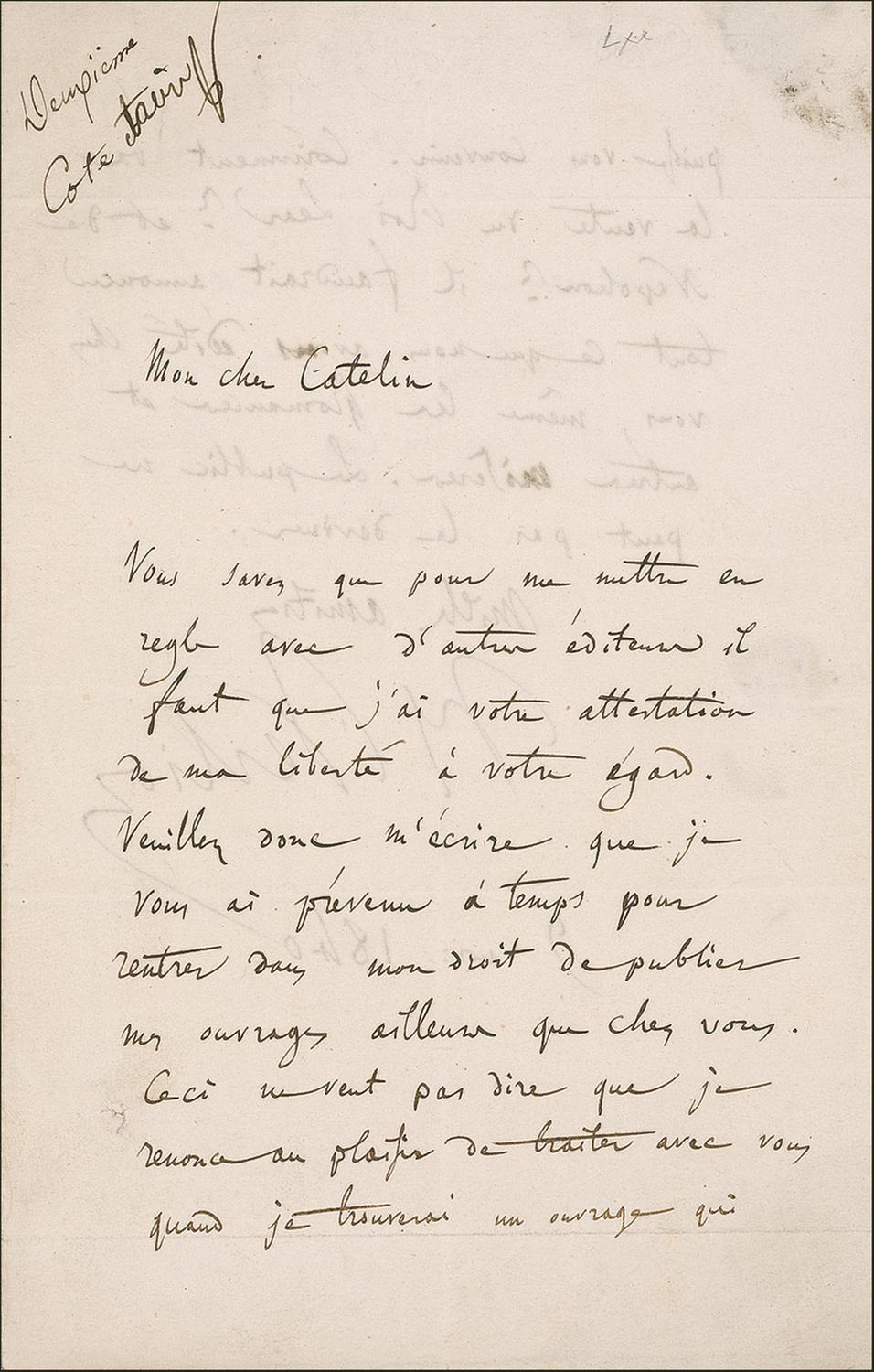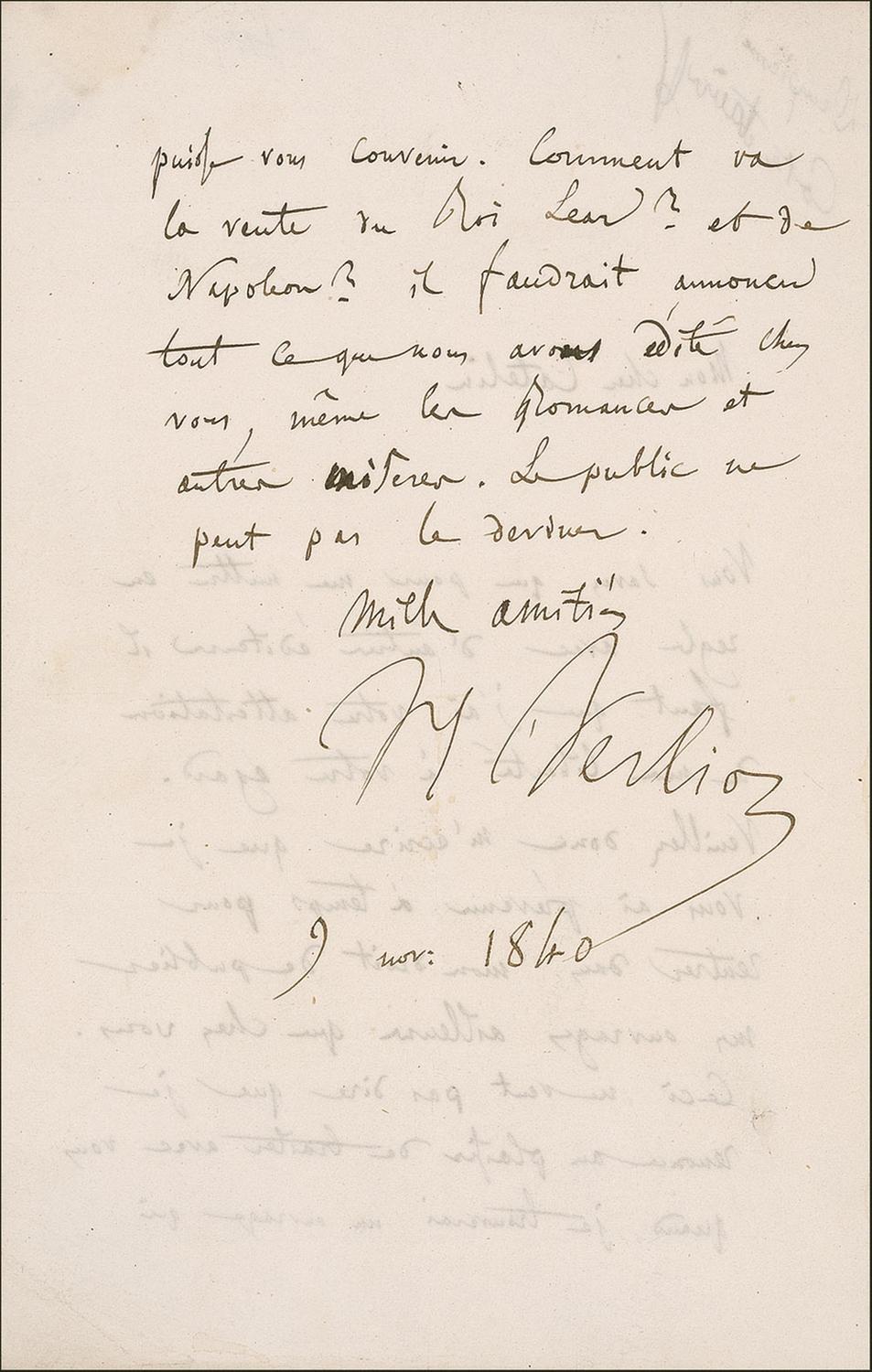 ALS in French, signed “Hector Berlioz,” one page both sides, 5.25 x 8, [November 9] 1840. Letter to Adolphe Catelin, his publisher. In full (translated): “You know that in order to put myself properly with some other editor, it is necessary that I have your affidavit freedom (release) from you. Please therefore write me that I have warned you in time in order to return to my right of publishing my works other than with you. That doesn't mean that I renounce the pleasure to deal with you with if will find a work that may be agreeable to you. How goes the sale of King Lear and of Napoleon? It would be necessary (therefore) to announce all that we have edited with you, even the Romances and other works. The public can not guess all this.” In very good condition with intersecting folds, staining from wax remnants on an integral page, and writing showing through from opposing sides.