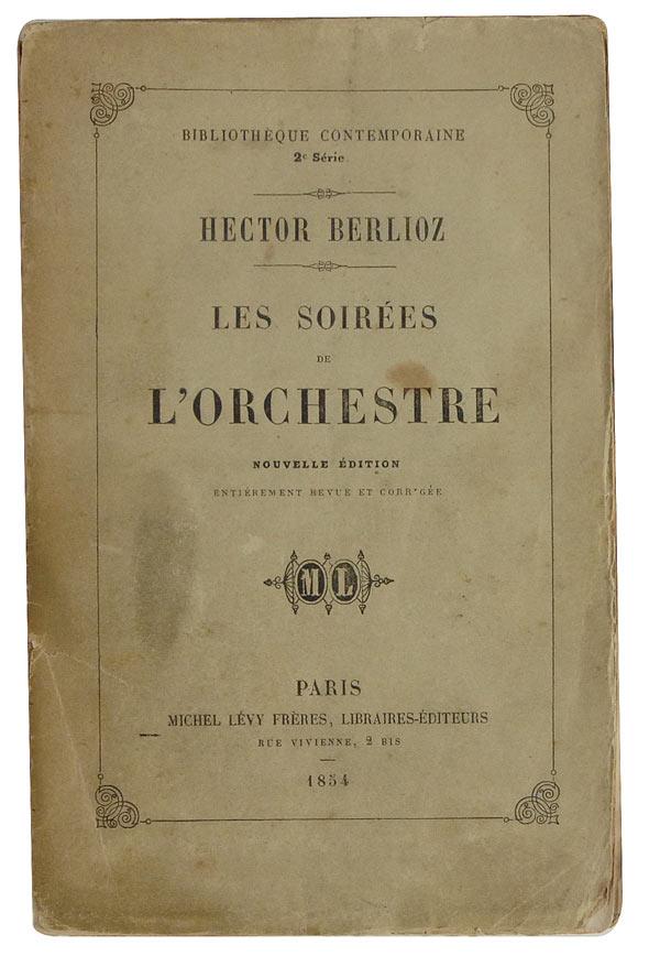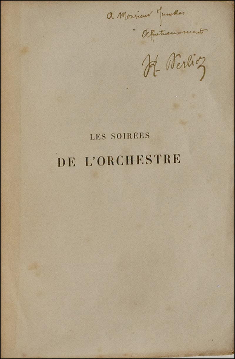Influential French composer (1803–1869) of such repertory staples as the programmatic ‘Symphonie Fantastique,’ the opera ‘Les Troyens,’ and the colorful ‘travelogue in tones’ Harold in Italy. Signed book: Les Soirees de L'Orchestre. Later printing. Paris: Michel Levy Freres, 1854. Softcover, 4.75 x 7.5, 435 pages. Inscribed, in French, on the half-title page to German portrait and historical painter, Wilheim Karl Juncker, and signed “H. Berlioz.” In fragile and overall good condition, with tape repair to separation between first free end page and half-title page, front cover attached by a single thread of binding, missing lower third of spine, scattered toning and foxing to covers and all inside pages, including signed page. Book is housed in a custom-made slipcase. An unusual format from the important composer who influenced Wagner, Liszt, and Mahler among others.