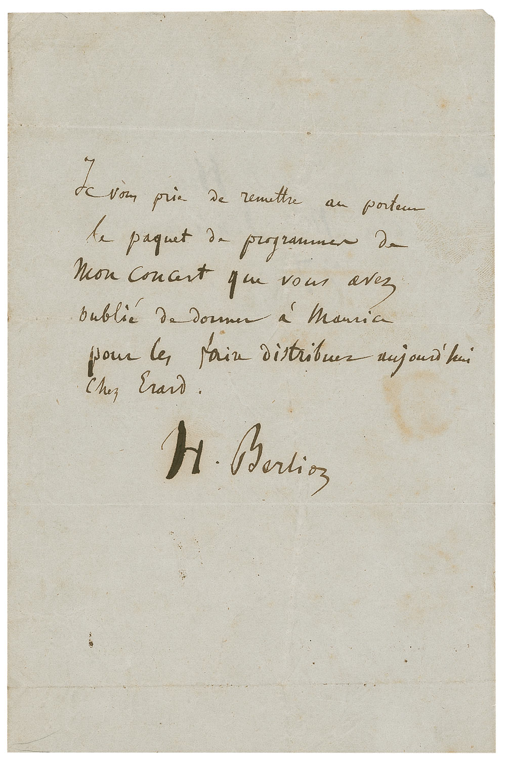 Influential French composer (1803–1869) of such repertory staples as the programmatic ‘Symphonie fantastique,’ the opera ‘Les Troyens,’ and the colorful ‘travelogue in tones’ Harold in Italy. ALS in French, signed “H. Berlioz,” one page, 5.25 x 8.25, no date. Letter to Mr. Henri, an employee of the firm of the famous music publisher Schlesinger, asking him to send the package with the printed programmes of his concert (that he forgot to give to Mr. Maurice). Berlioz needs these programs to distribute them today to the guests at the house of Mr. Erard, (the famous piano-maker). In very good condition, with intersecting folds, one through a single letter of signature, scattered toning and soiling, and light creases and wrinkles.