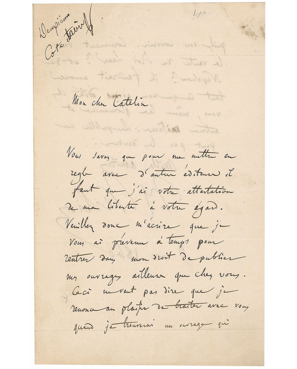 Berlioz and his publisher Catelin had worked together since 1836, promoting, among other pieces, the piano reduction of the cantata Le Cinq Mai, written in 1835, and the full score of Le Roi Lear—an overture to King Lear composed in 1831 and performed often in his concert tours. Although “the sale of King Lear and of Napoleon” (another work honoring one of his heroes) seemed to be going well, Berlioz was less than impressed with the marketing job done by Catelin regarding any of his newer works, prompting him to seek a release. Any correspondence between Berlioz and Catelin is very desirable.