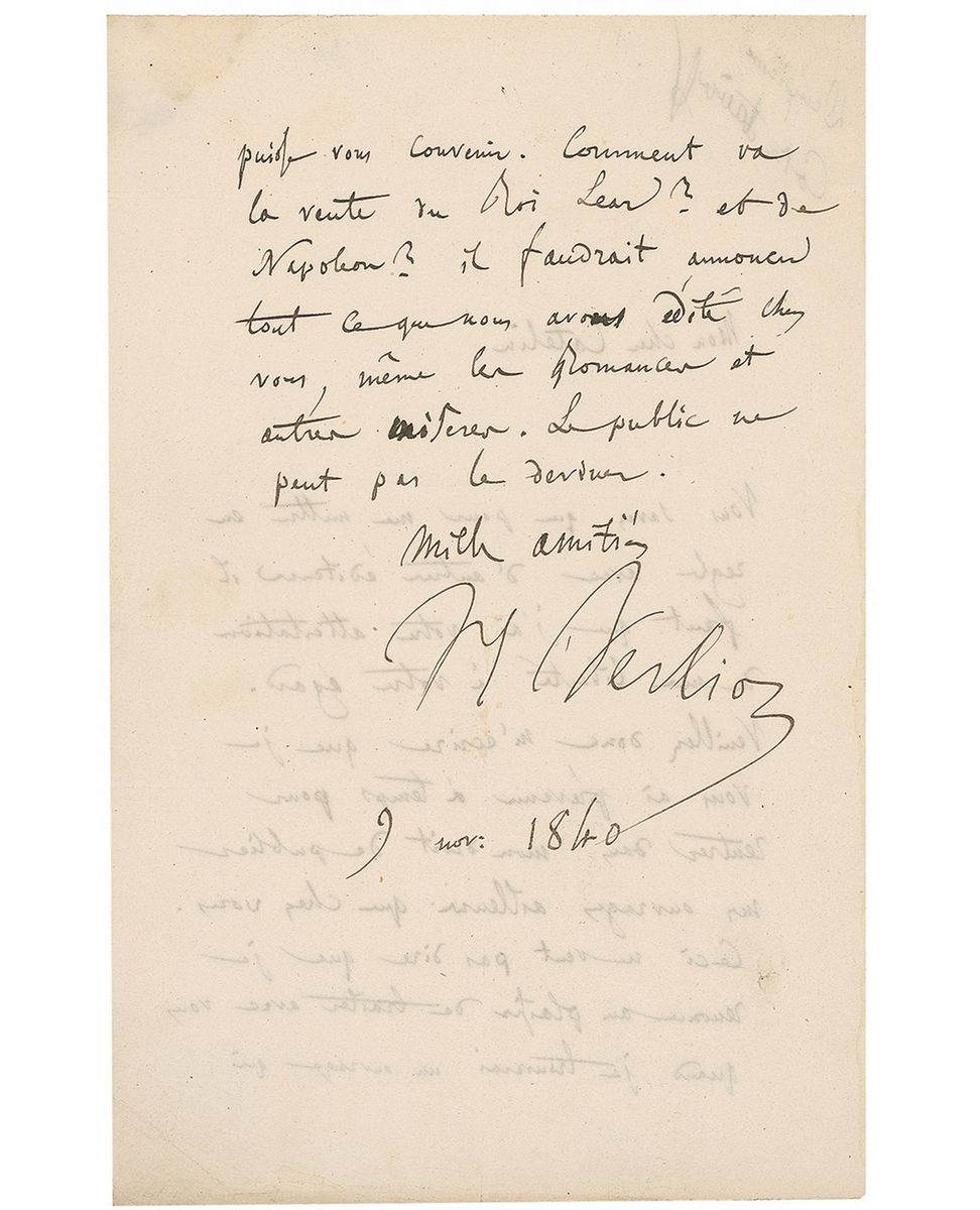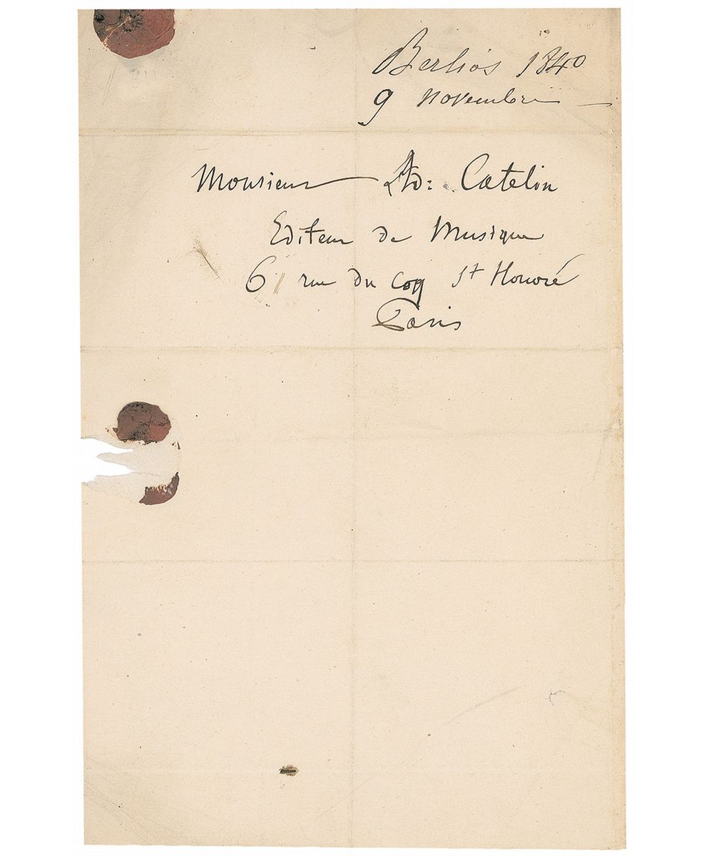 Influential French composer (1803–1869) of such repertory staples as the programmatic ‘Symphonie Fantastique,’ the opera ‘Les Troyens,’ and the colorful ‘travelogue in tones’ Harold in Italy. ALS in French, signed “Hector Berlioz,” one page both sides, 5.25 x 8, [November 9] 1840. Letter to Adolphe Catelin, his publisher. In full (translated): “You know that in order to put myself properly with some other editor, it is necessary that I have your affidavit freedom (release) from you. Please therefore write me that I have warned you in time in order to return to my right of publishing my works other than with you. That doesn't mean that I renounce the pleasure to deal with you with if will find a work that may be agreeable to you. How goes the sale of King Lear and of Napoleon? It would be necessary (therefore) to announce all that we have edited with you, even the Romances and other works. The public can not guess all this.” Reverse of second integral page also bears an address panel in Berlioz’s hand. In very good condition with intersecting folds, staining from wax remnants on an integral page, and writing showing through from opposing sides.