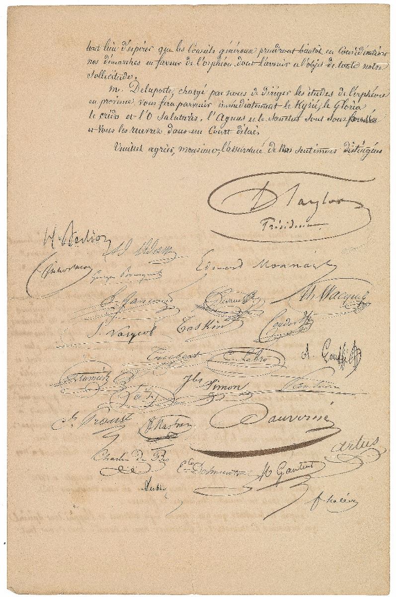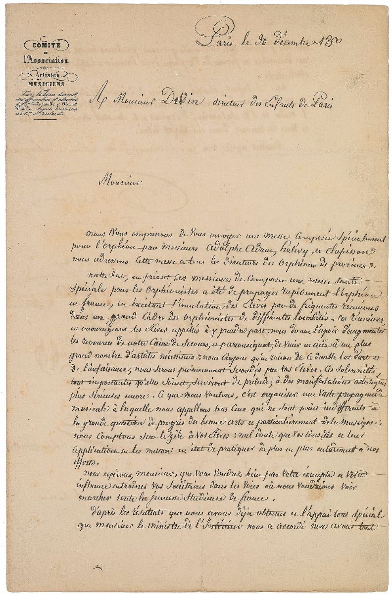 Interesting LS in French, signed “H. Berlioz,” one page both sides, 8.75 x 13.5, Committee of the Association of Musicians letterhead, December 30, 1850. Letter to Mr. Devin, in part (translated): "We are sending you a mass especially composed for Choral Societies by Adolphe Adam, Halevy and Clupisson. We are sending this mass to Choral Society directors in all provinces. By doing so, we hope to help the propagation of Choral Societies around the country…We believe that students will respond favorably to this artistic and charitable effort. These informal gatherings will lead to more sophisticated artistic events. We would like to launch a big musical campaign, that could appeal to all those who care about music and about the progress of the fine arts.” Signed at the conclusion by Berlioz and more than twenty others. In fine condition.