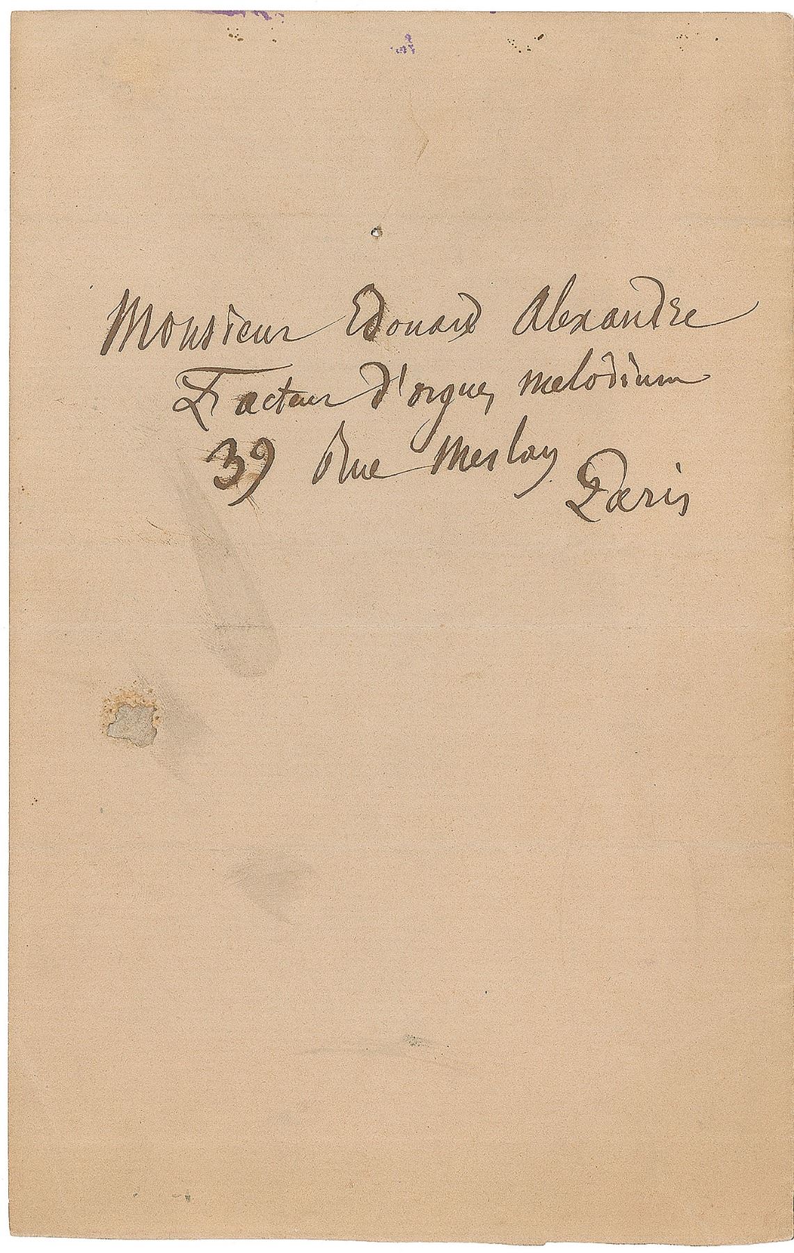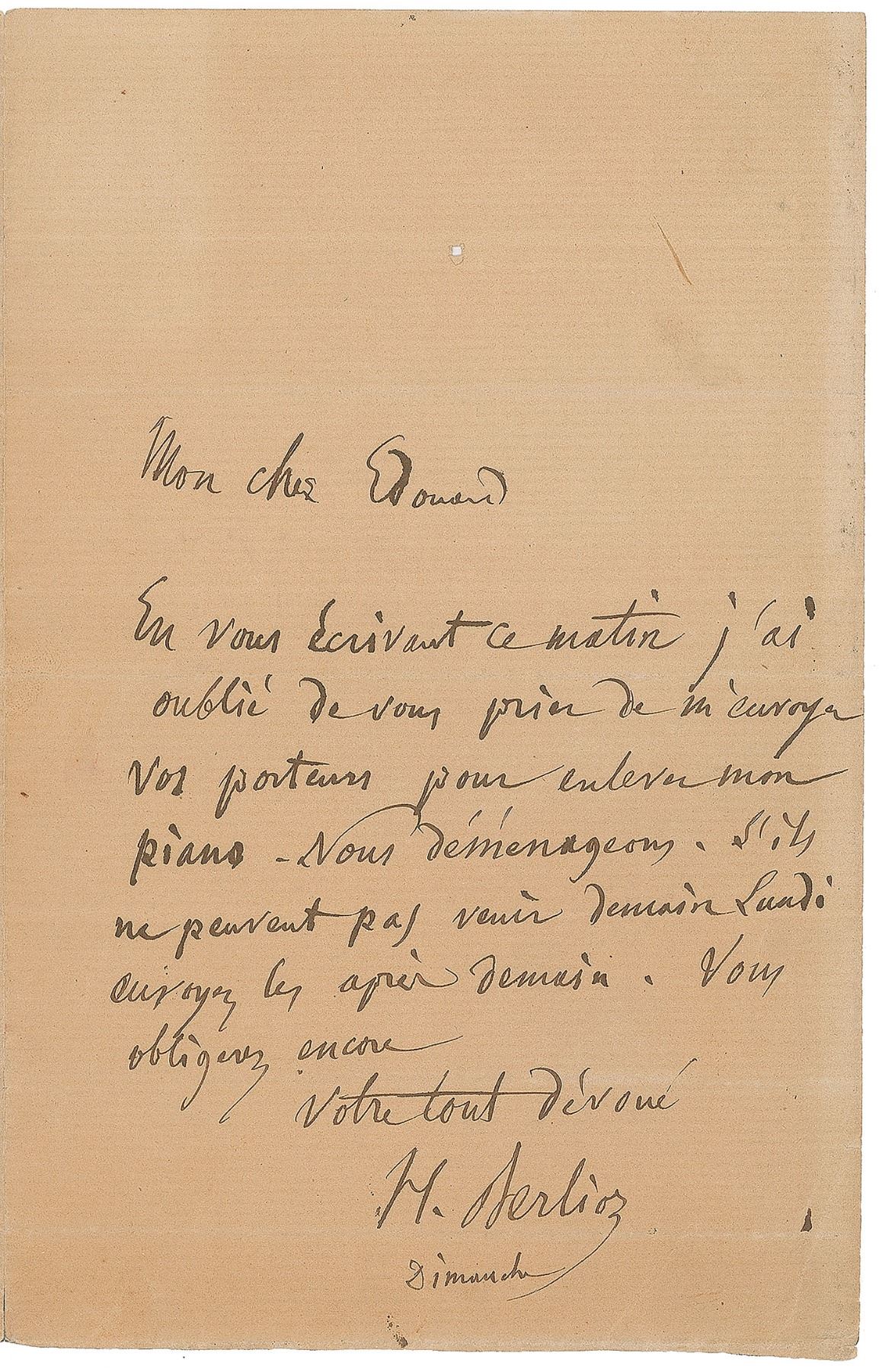 ALS in French, signed “H. Berlioz,” one page, 5.25 x 8.25, no date. Letter to his friend Edouard Alexandre, an organ manufacturer, on moving his piano. In part (translated): “By writing to you this morning I forgot to ask you to send me your porters to remove my piano—we are moving. If they can not come tomorrow, Monday, send after tomorrow.” Addressed on the reverse in Berlioz's own hand. In very good to fine condition, with multiple horizontal folds, light toning, and tack hole to the top blank area.