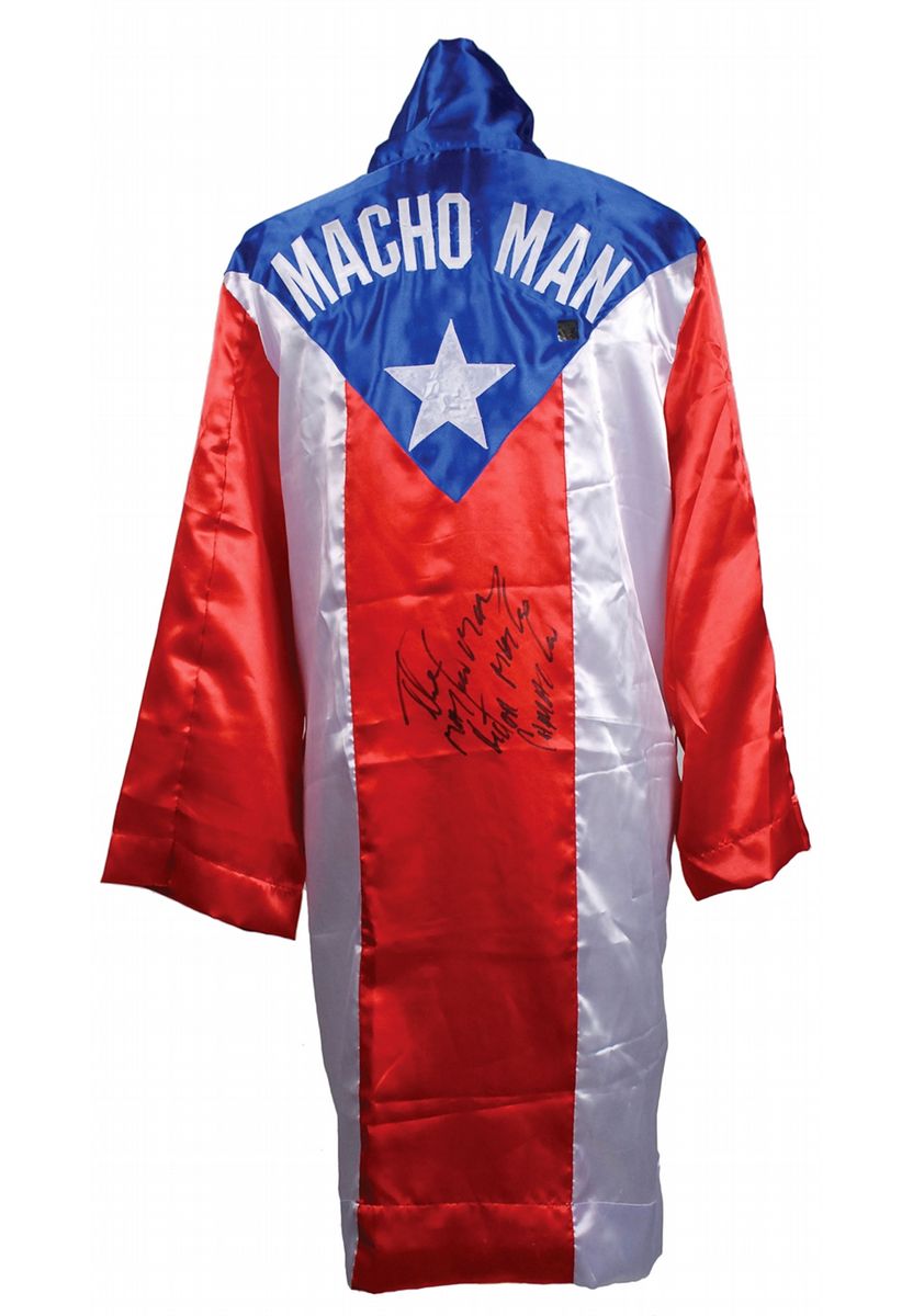 Red, white, and blue ‘Macho man’ boxing robe signed in black felt tip on the back. In fine condition. Accompanied by a photo of Camacho posing with the robe after signing.