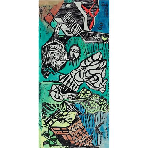 Hector Ortega (Venezuelan/Spanish, 20th century), "Emigrante a Jesus Carpintero", c. 1960; woodblock print with hand coloring, 10" x 20", signed and titled in pencil.
