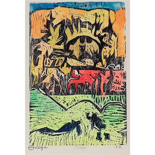 Hector Ortega (Venezuelan/Spanish, 20th century), "Campa", c. 1960; woodblock print with hand coloring, 12" x 9", signed and titled in pencil, with "5-2".