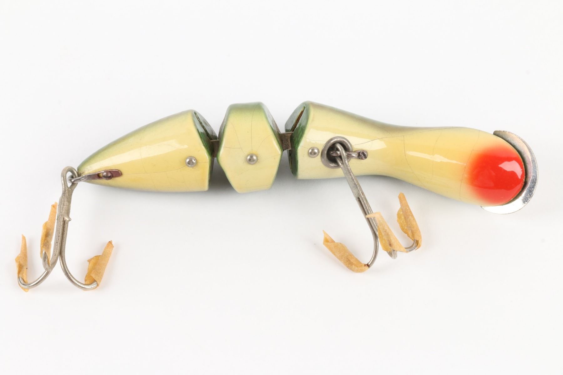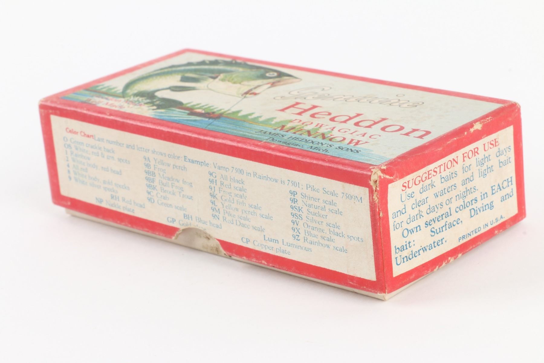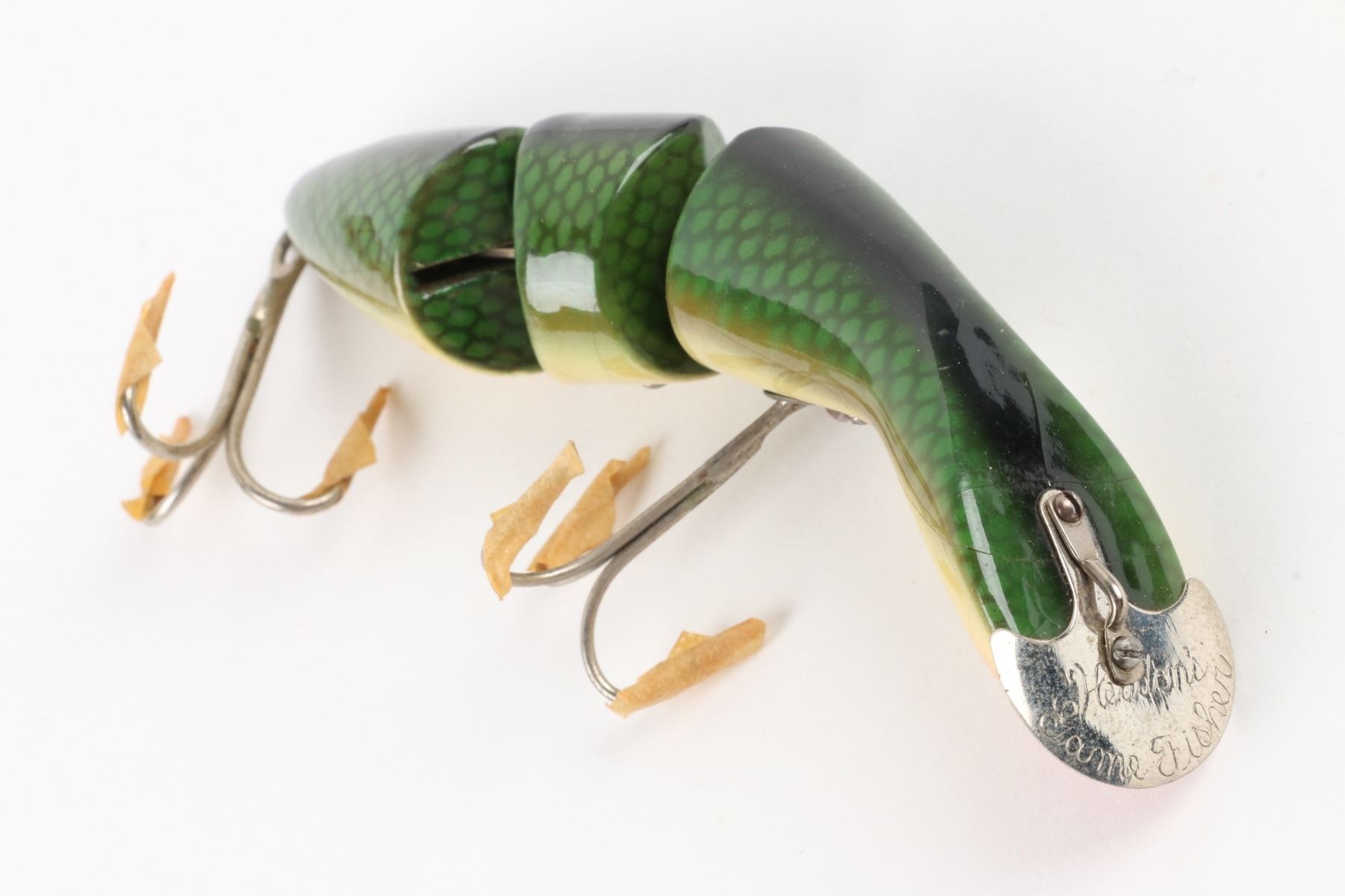 Heddon, United States. 1930s. Boxed. Material: Wood. Quantity: 1. Green scale. Grade: VG+. 4.75". Est. $75-100.