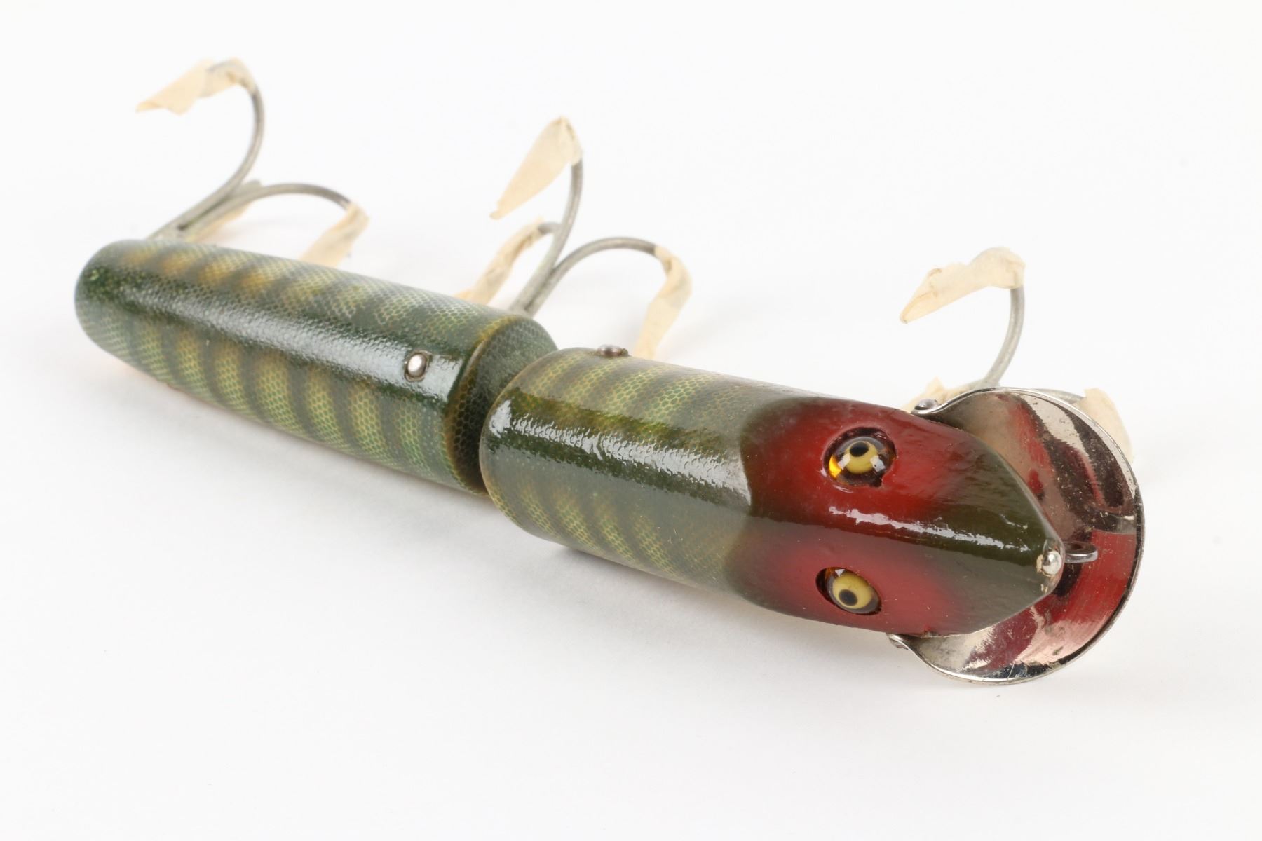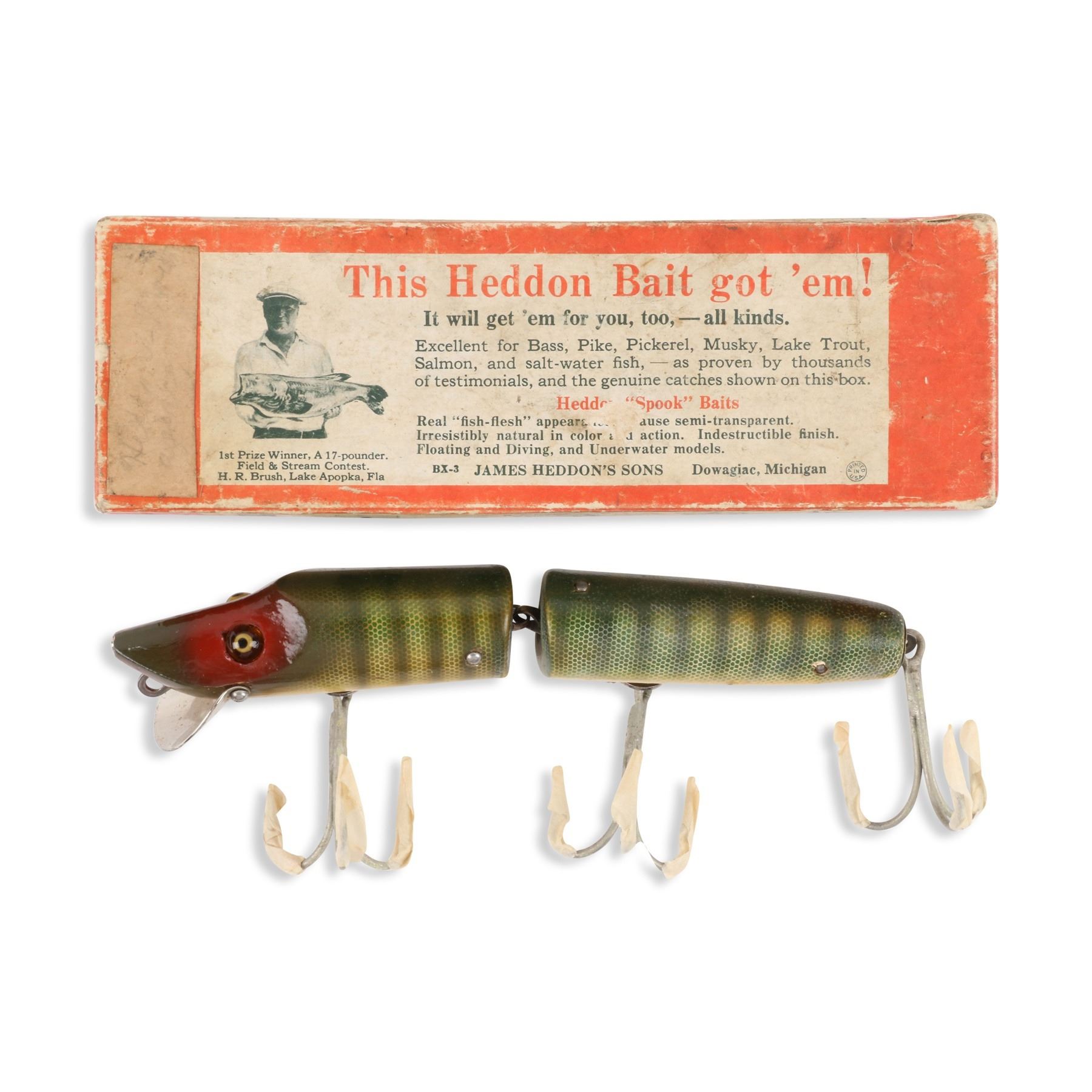 Heddon, United States. 1930s. Boxed. Material: Wood. Quantity: 1. Pike scale. Grade: VG+. 7.25" box. Est. $100-125.