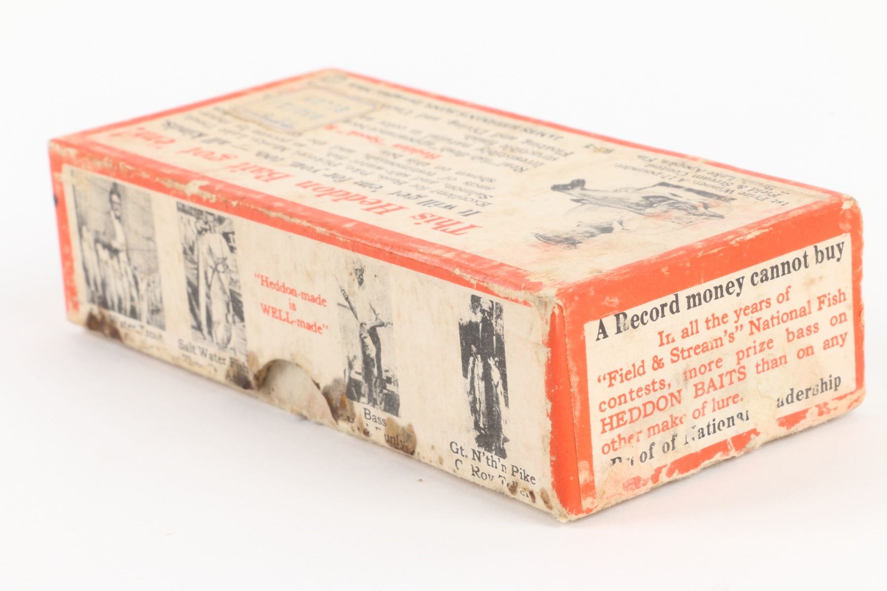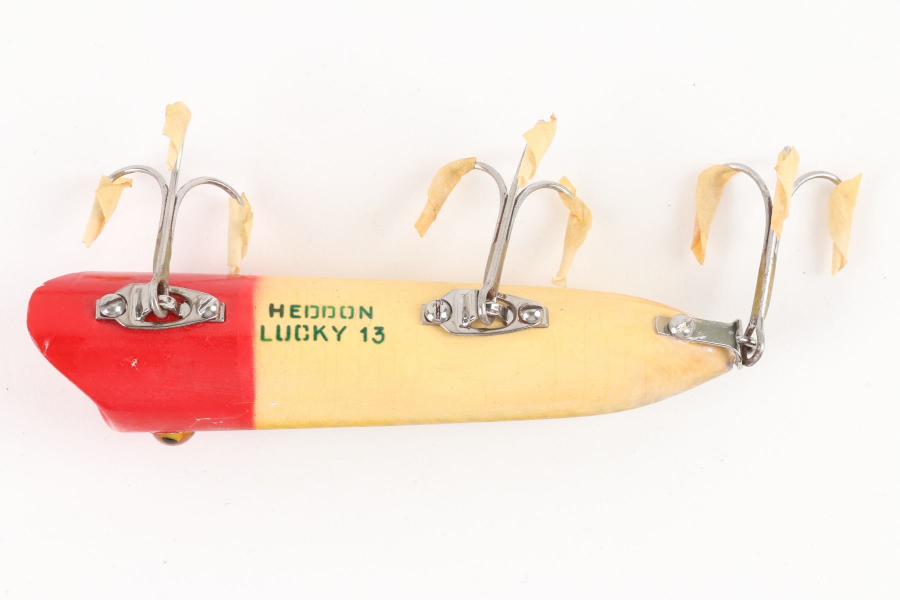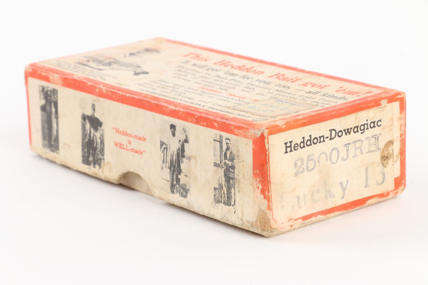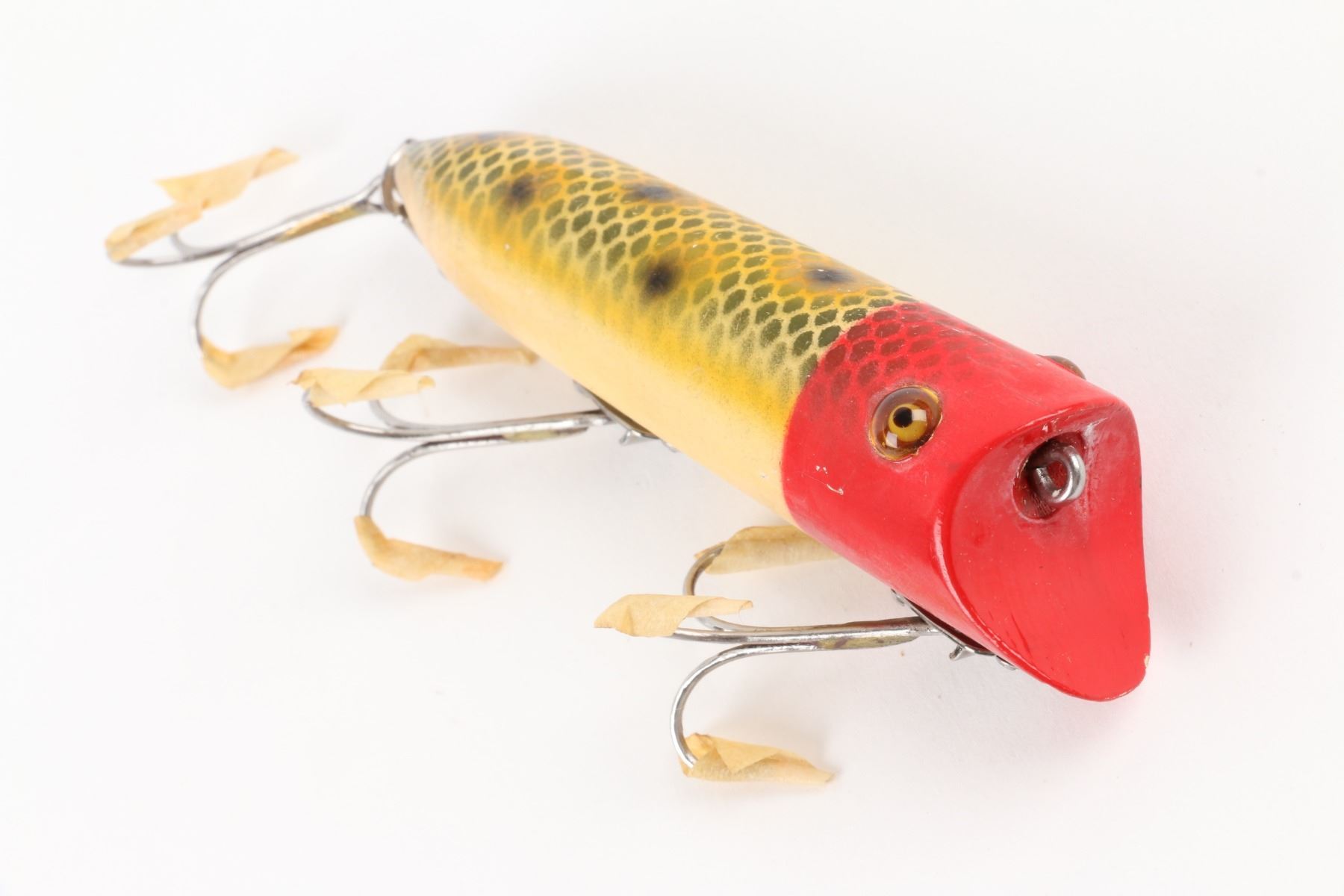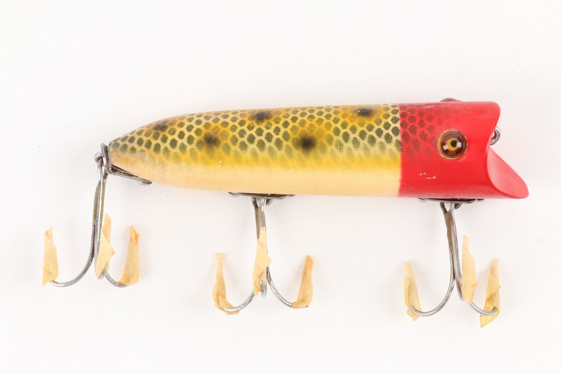 Heddon, United States. 1940s. Boxed. Material: Wood. Quantity: 1. Frog Scale with Red Head. Grade: VG+. 4.5" box. Est. $75-100.