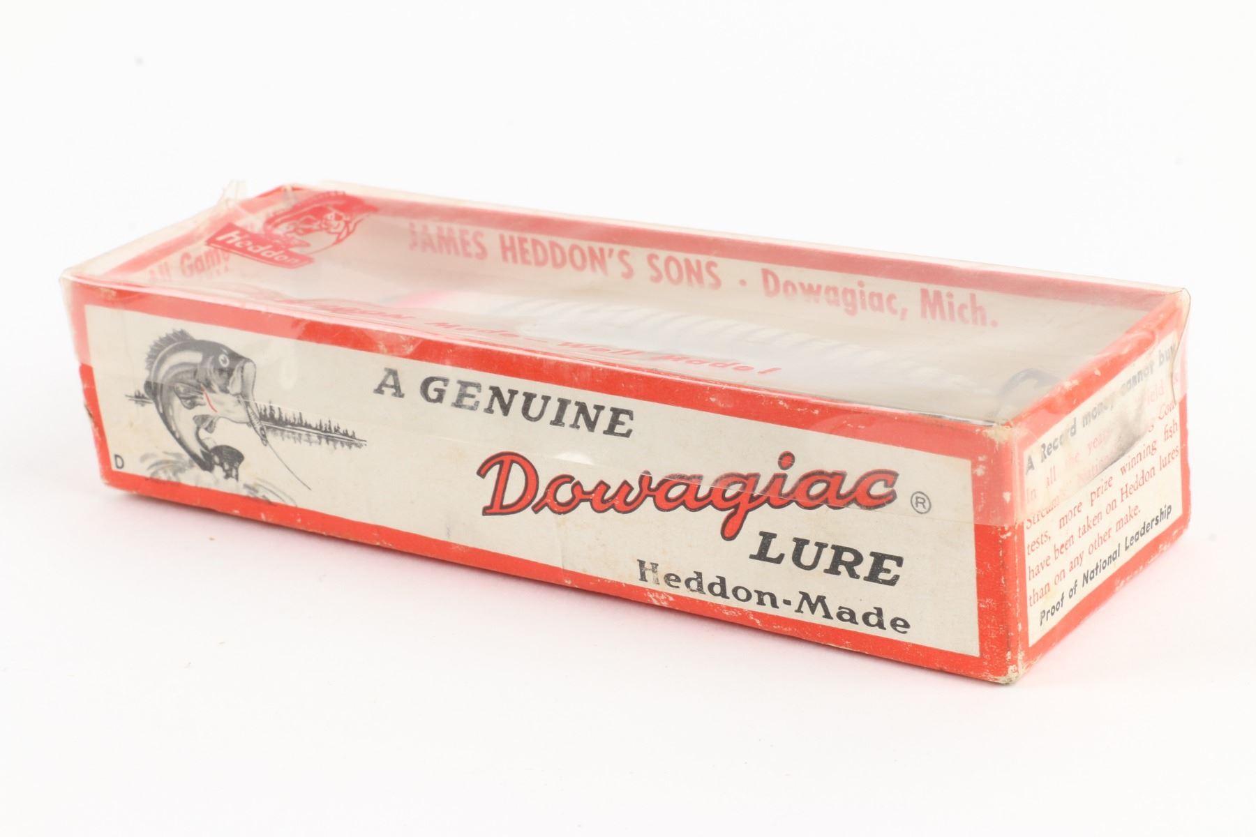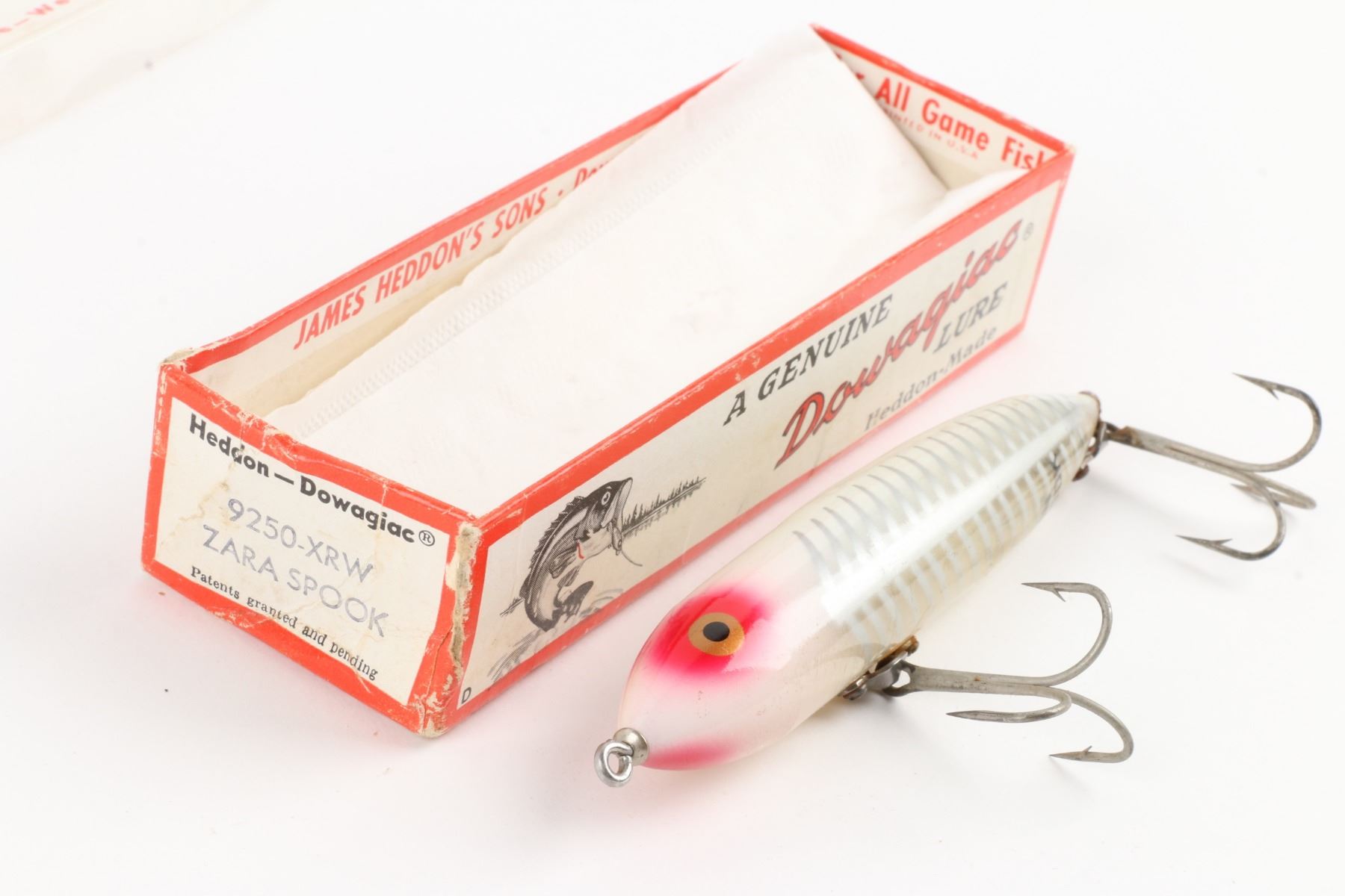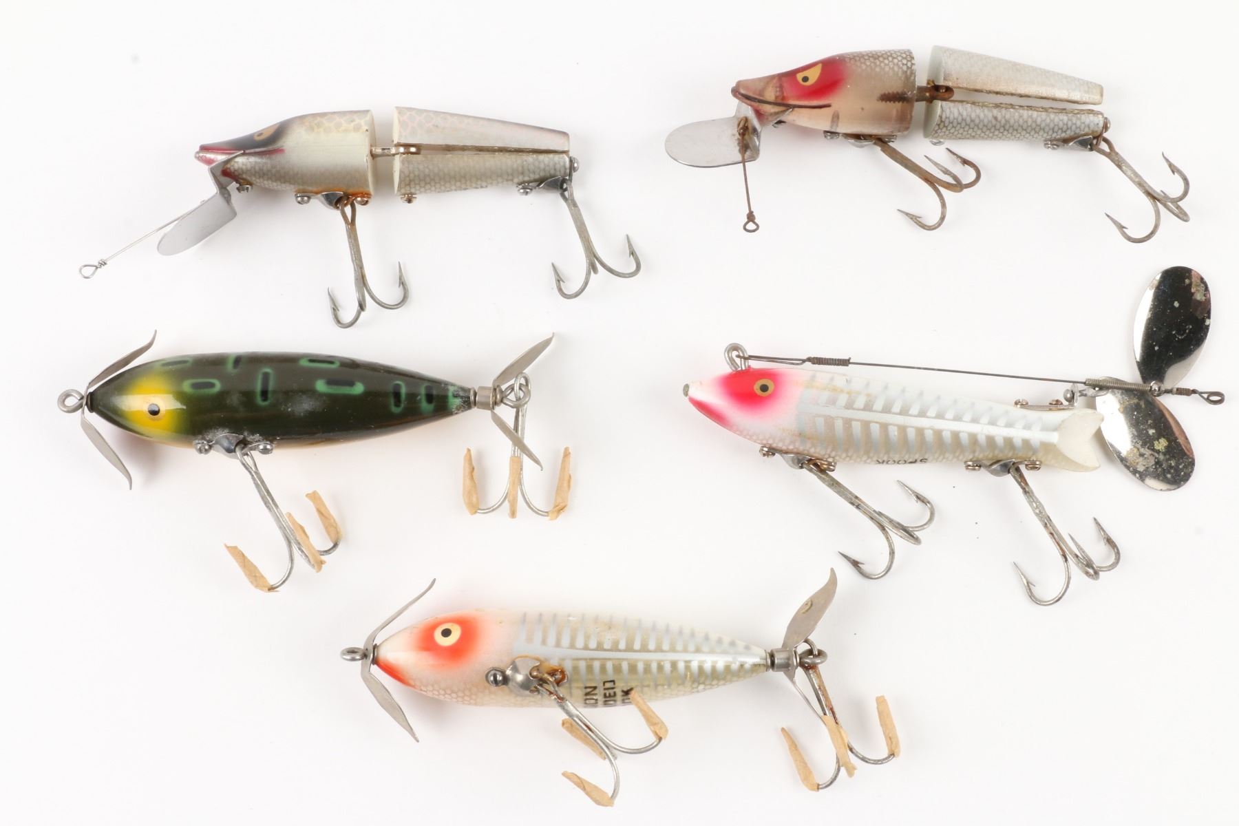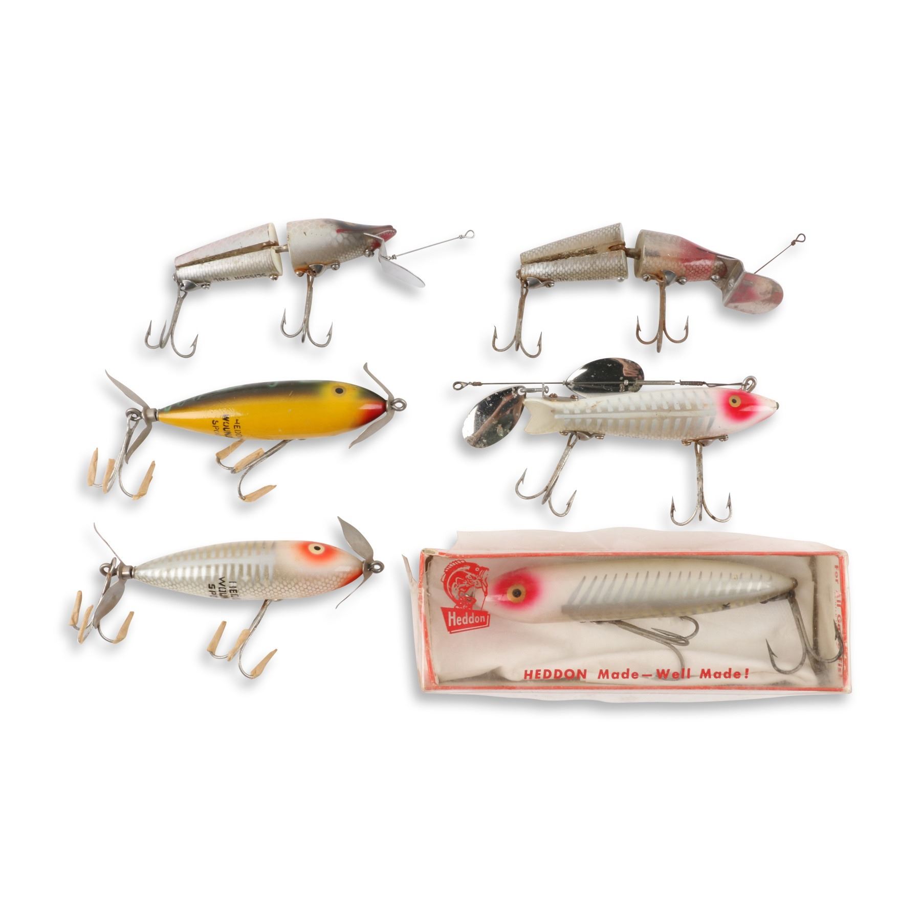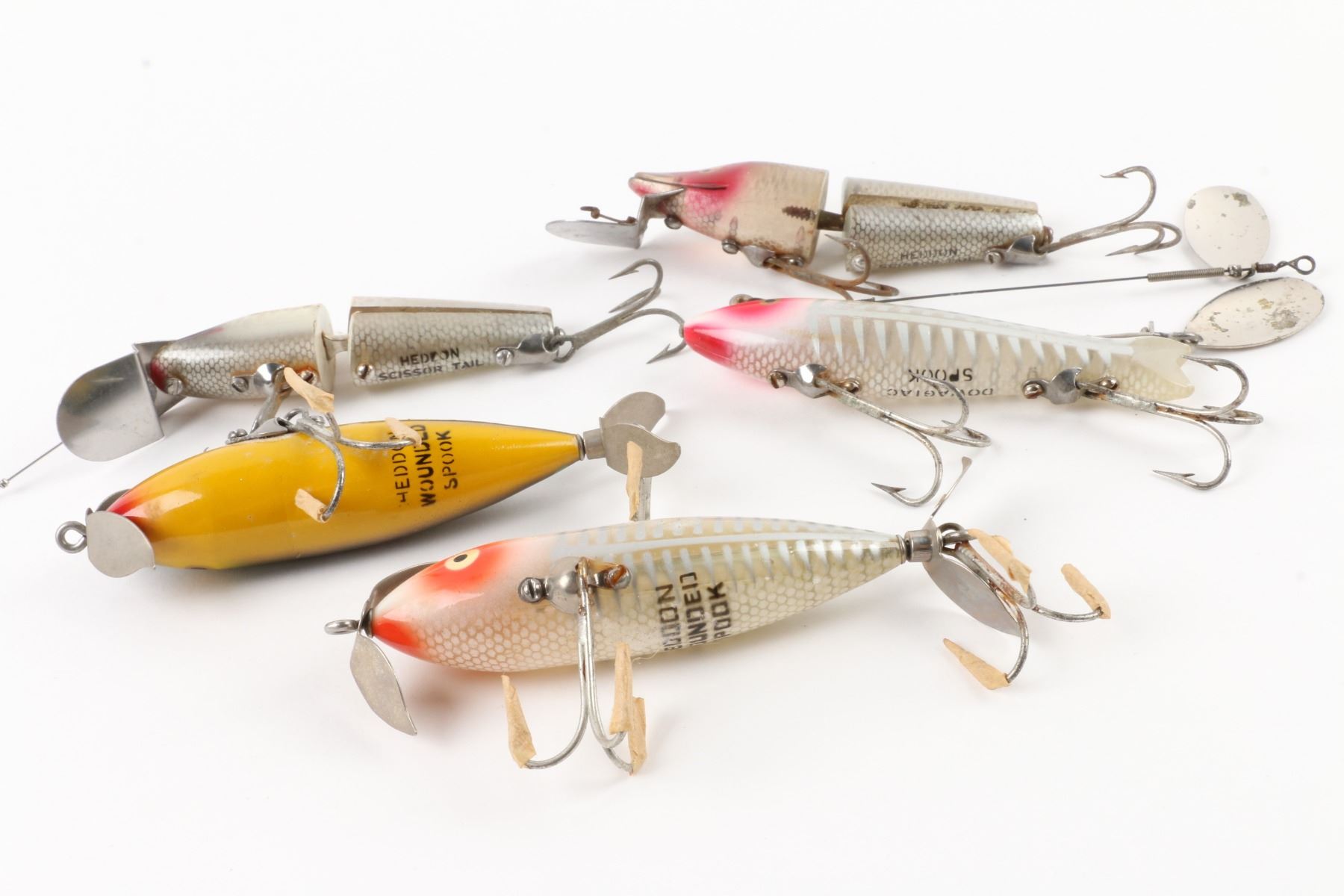 Heddon, United States. 1950s. Material: Plastic. Quantity: 5. 2 Heddon Wounded Spook, Dowagiac Spook, 2 Scissor Tail. Grade: VG. 3.5" - 4.5". Est. $75-100.