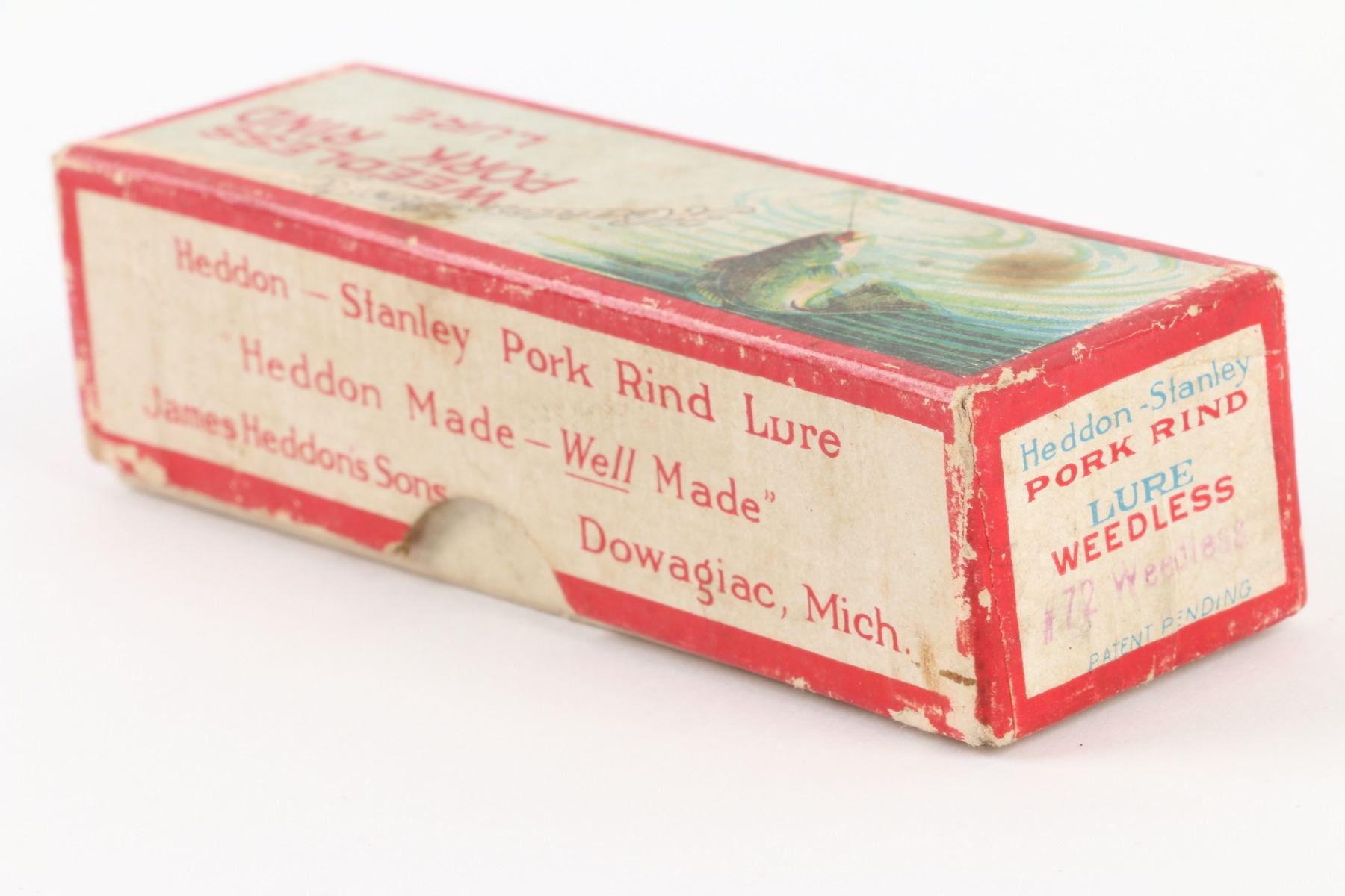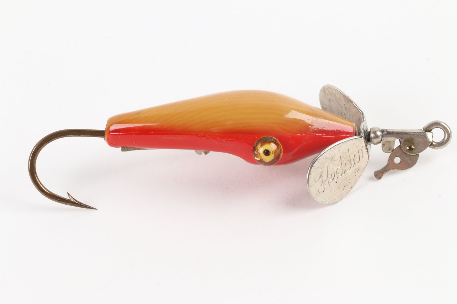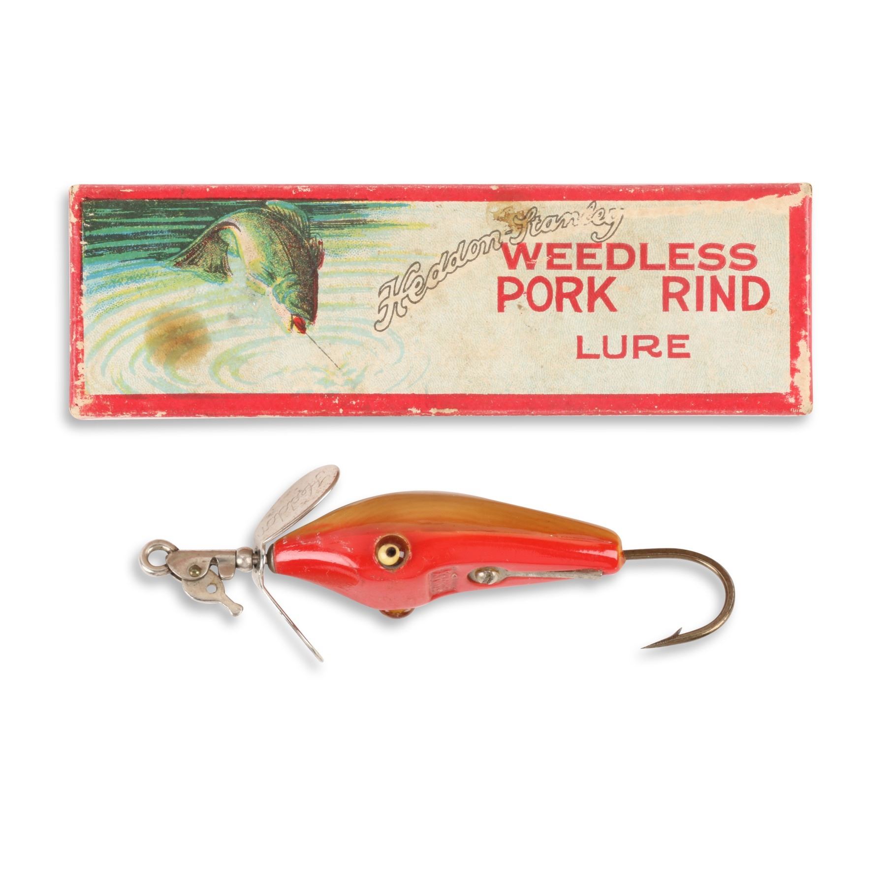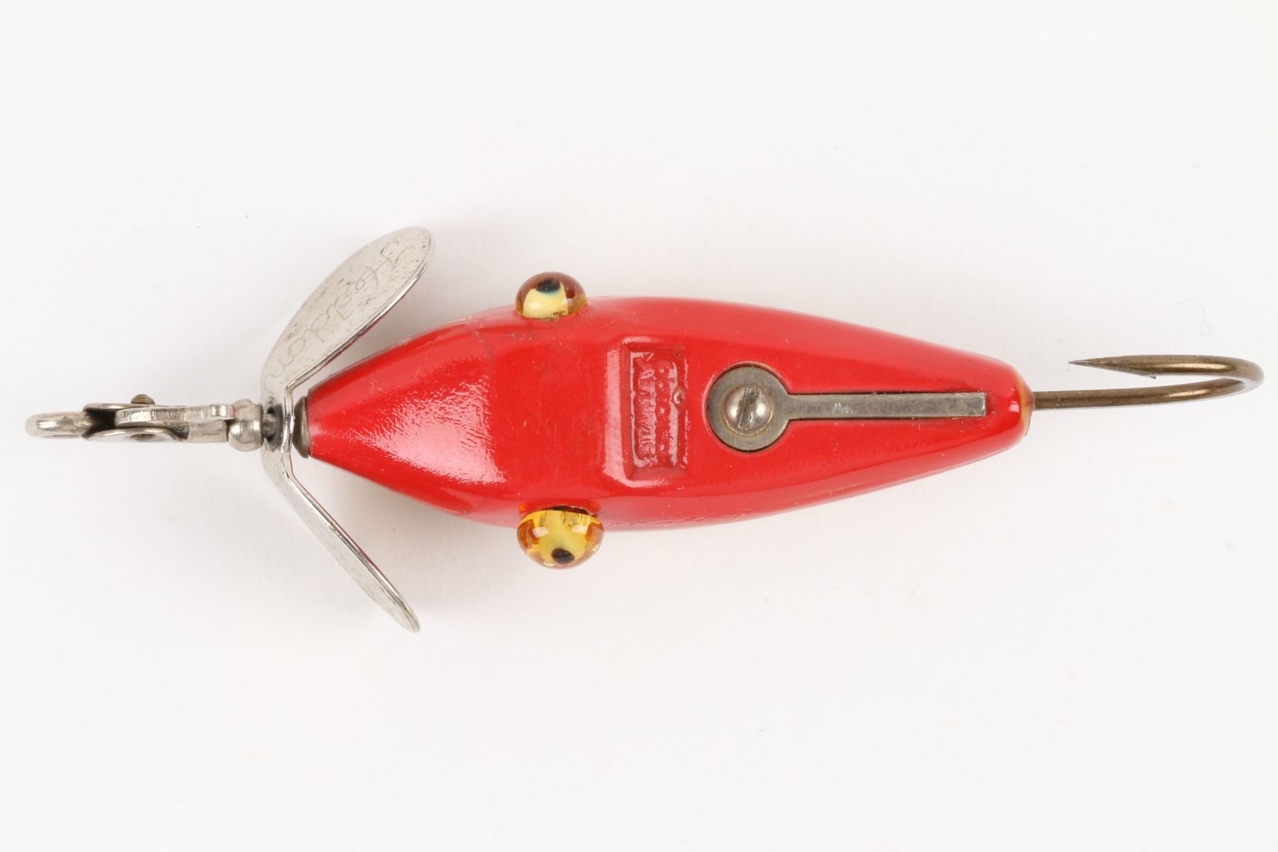 Heddon, United States. 1920s. Boxed. Material: Bakelite or Pyraline. Quantity: 1. Red and white. Grade: VG+. 4" box. Est. $50-75.