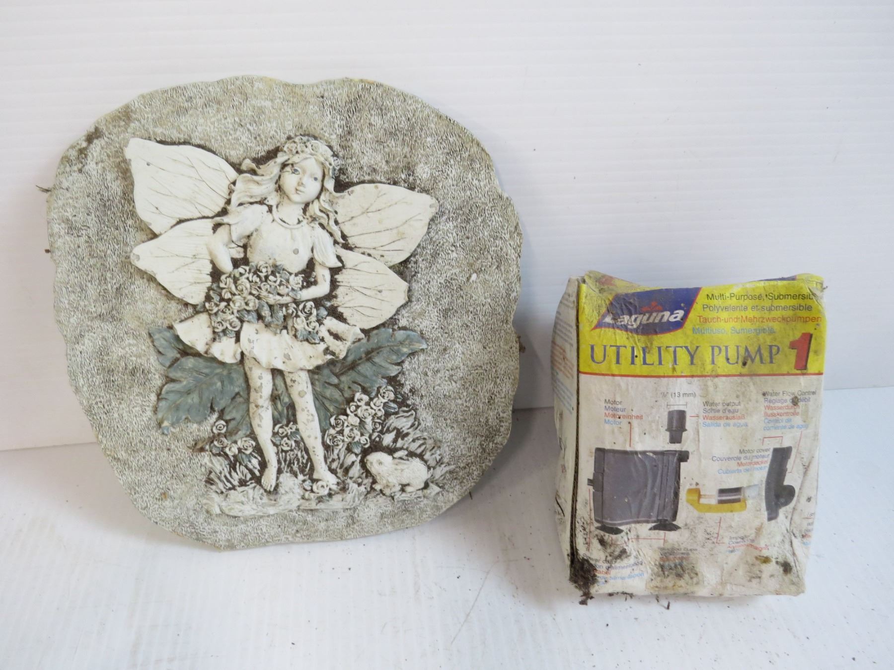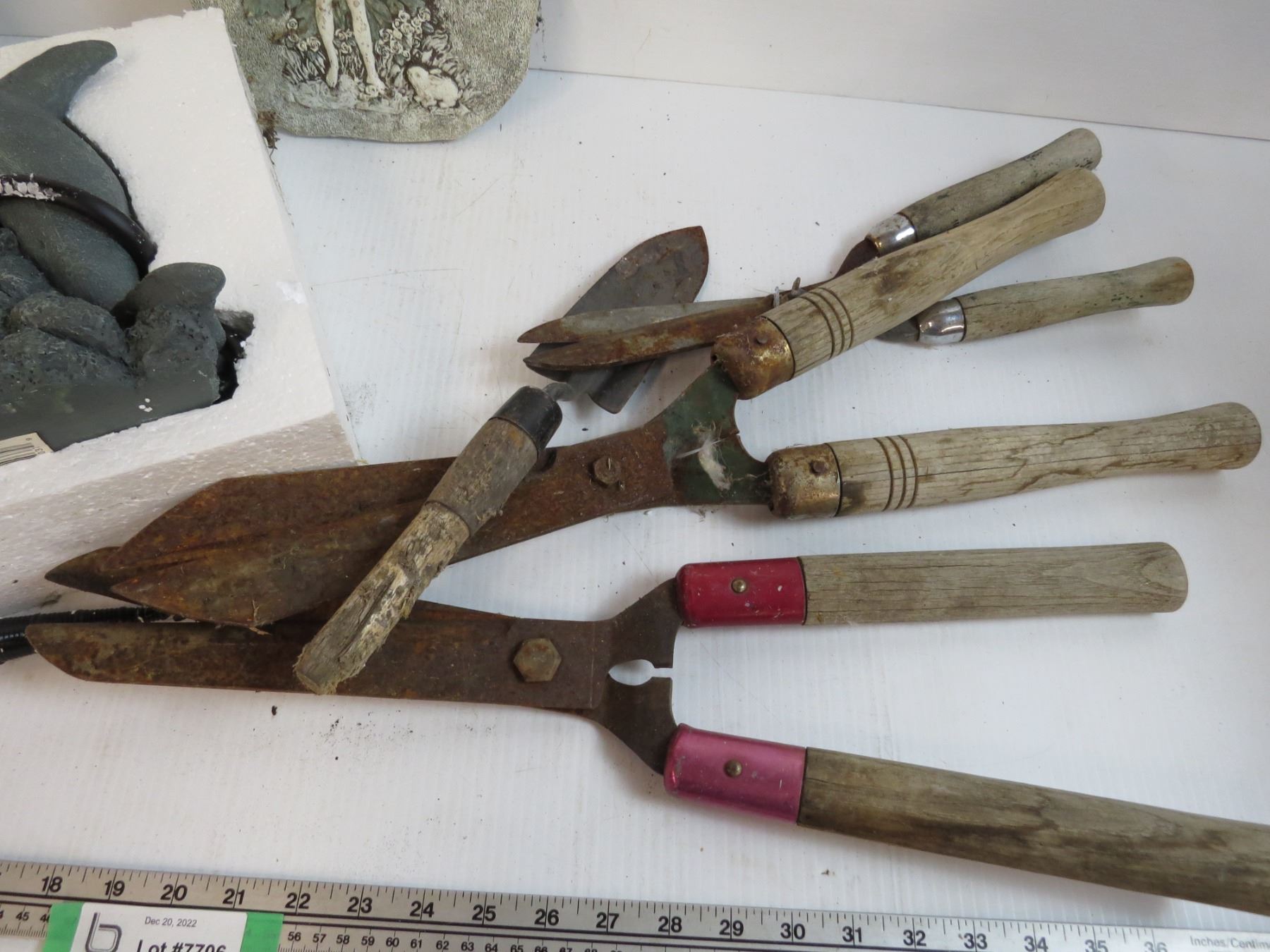 Hedge Trimmers & Hand Spade - Dolphin Fountain & Pump (untested) - Milk Crate - Plaque