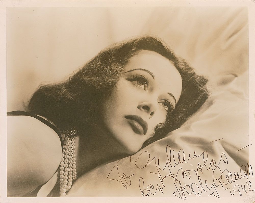 Vintage matte-finish 10 x 8 photo of Lamar resting her head on a cushion, signed and inscribed in fountain pen “To Gylian—Best wishes—Hedy Lamarr 1942.” Creases to three corner tips, a diagonal crease to lower left, and a bit of trivial staining to lower left, otherwise fine condition.
