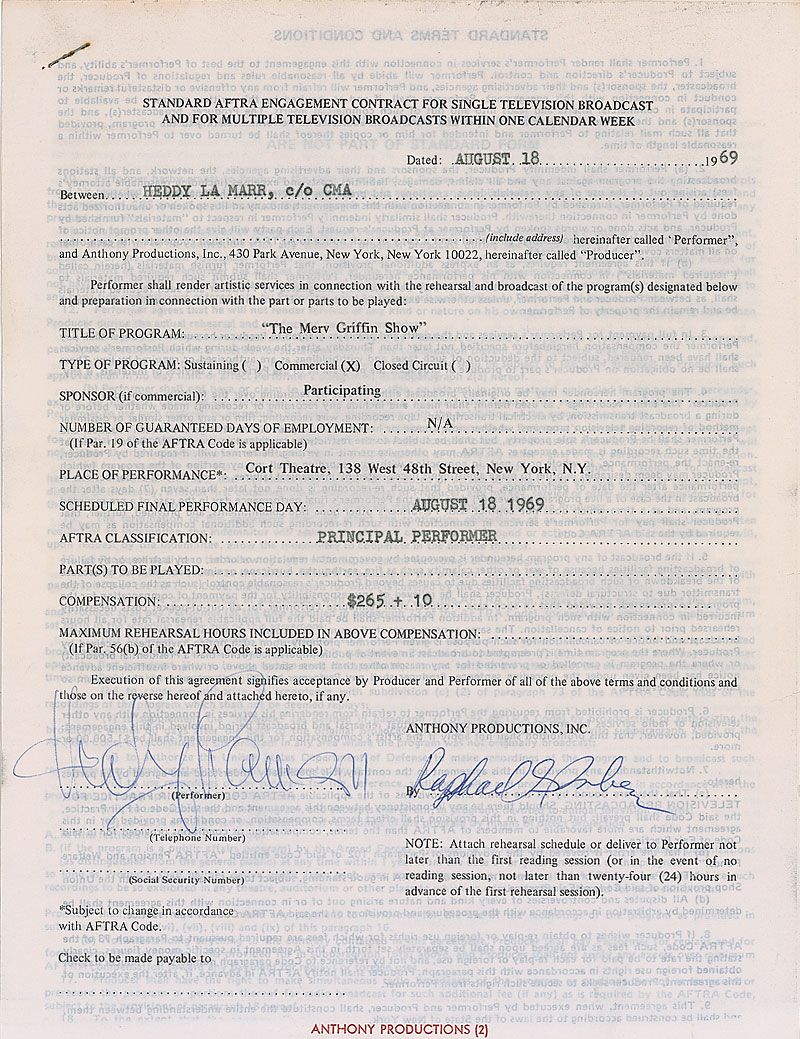 DS, one page, 8.5 x 11, August 18, 1969. Standard AFTRA contract in which Lamarr agrees to appear on The Merv Griffin Show on the same day in exchange for $265 plus a 10% agency commission. Signed at the conclusion in ballpoint by Lamarr. A standard AFTRA rider is stapled to the main document in the upper left. In fine condition, with expected document wear.