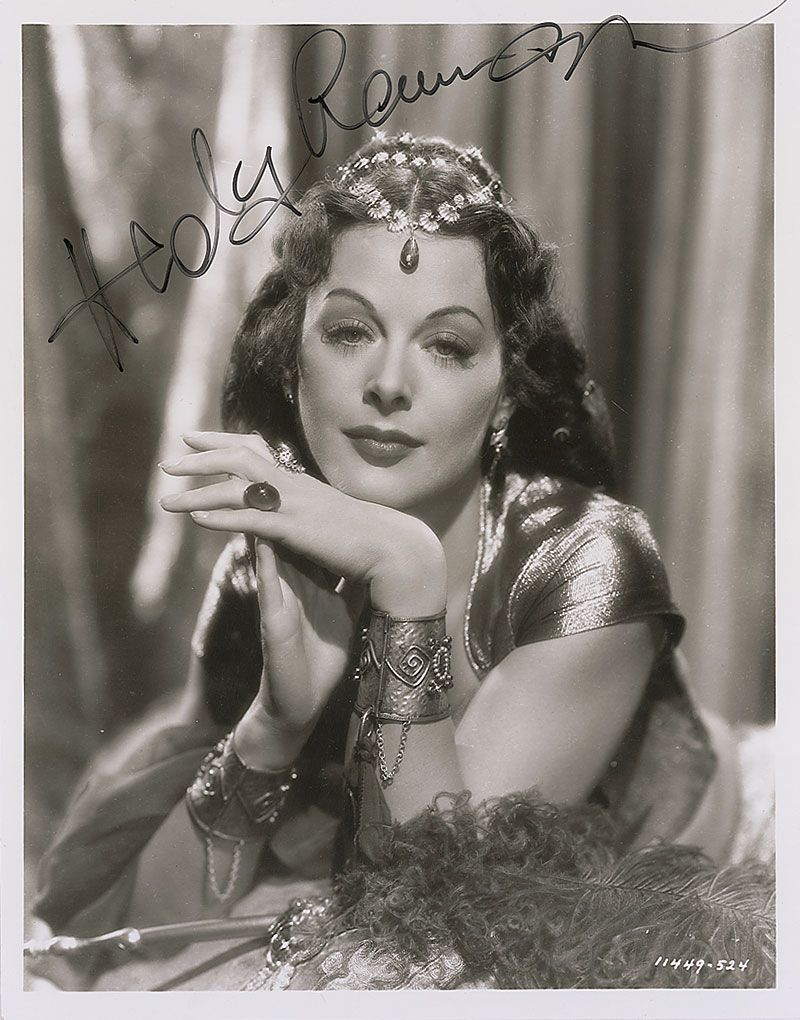 Exotic glossy 8 x 10 photo of Lamarr in an extravagant costume, signed in black felt tip. In fine condition.