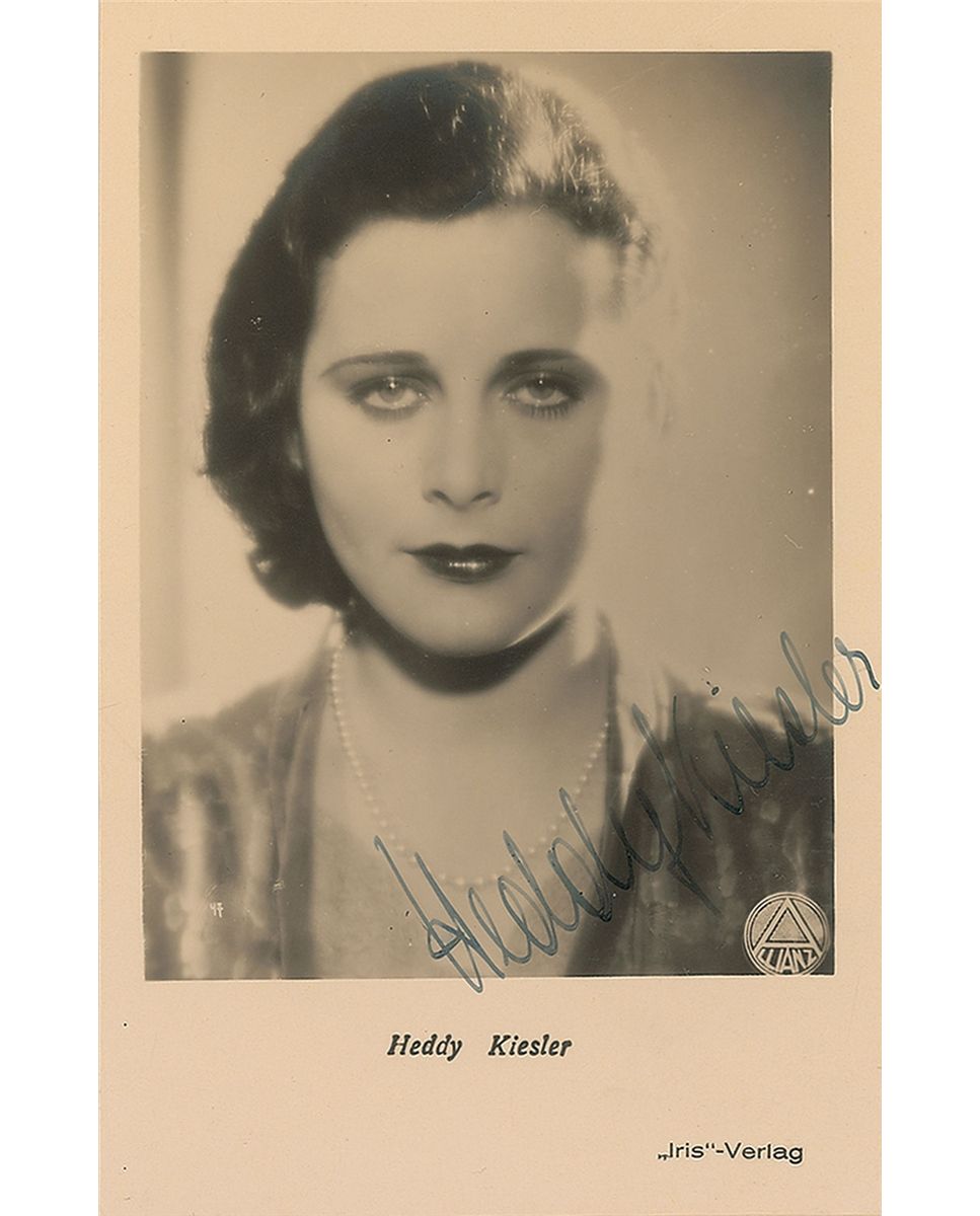 Early vintage matte-finish 3.5 x 5.5 photo, signed in fountain pen, “Hedy Kiesler,” her original surname, used until the early 1930s. A diagonal crease to top left corner, otherwise fine condition. A scarce and desirable example.