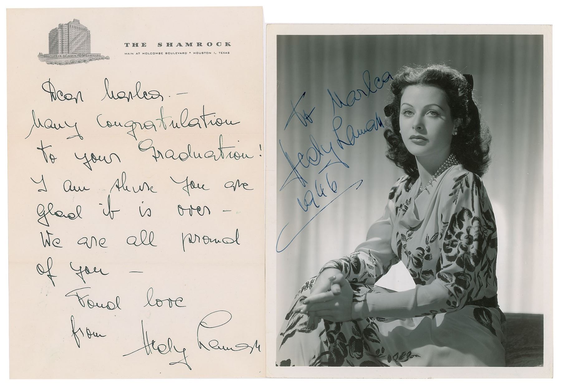 Two items: an ALS, one page, 7.25 x 10.5, The Shamrock letterhead, postmarked June 4, 1952, addressed to Marlea Neal, in full: "Many congratulation to your graduation! I am shure you are glad it is over—We are all proud of you"; and a vintage glossy 8.25 x 10 photo of Lamarr wearing a floral pattern dress in a lovely seated pose, signed and inscribed in fountain pen, "To Marlea, Hedy Lamarr, 1964." In overall very good to fine condition, with scattered light creasing to the photo. Accompanied by the original mailing envelope for the letter, which is addressed in Lamarr's own hand.