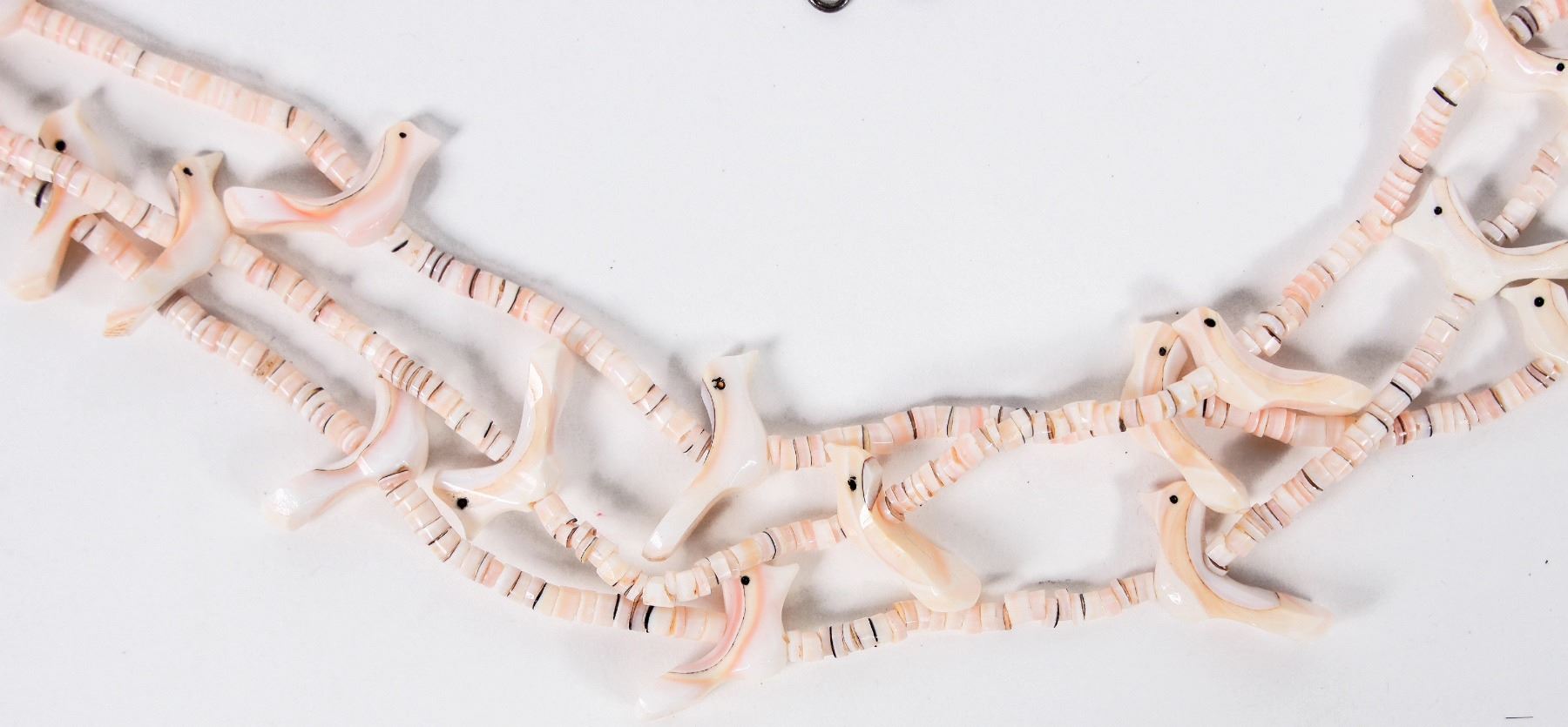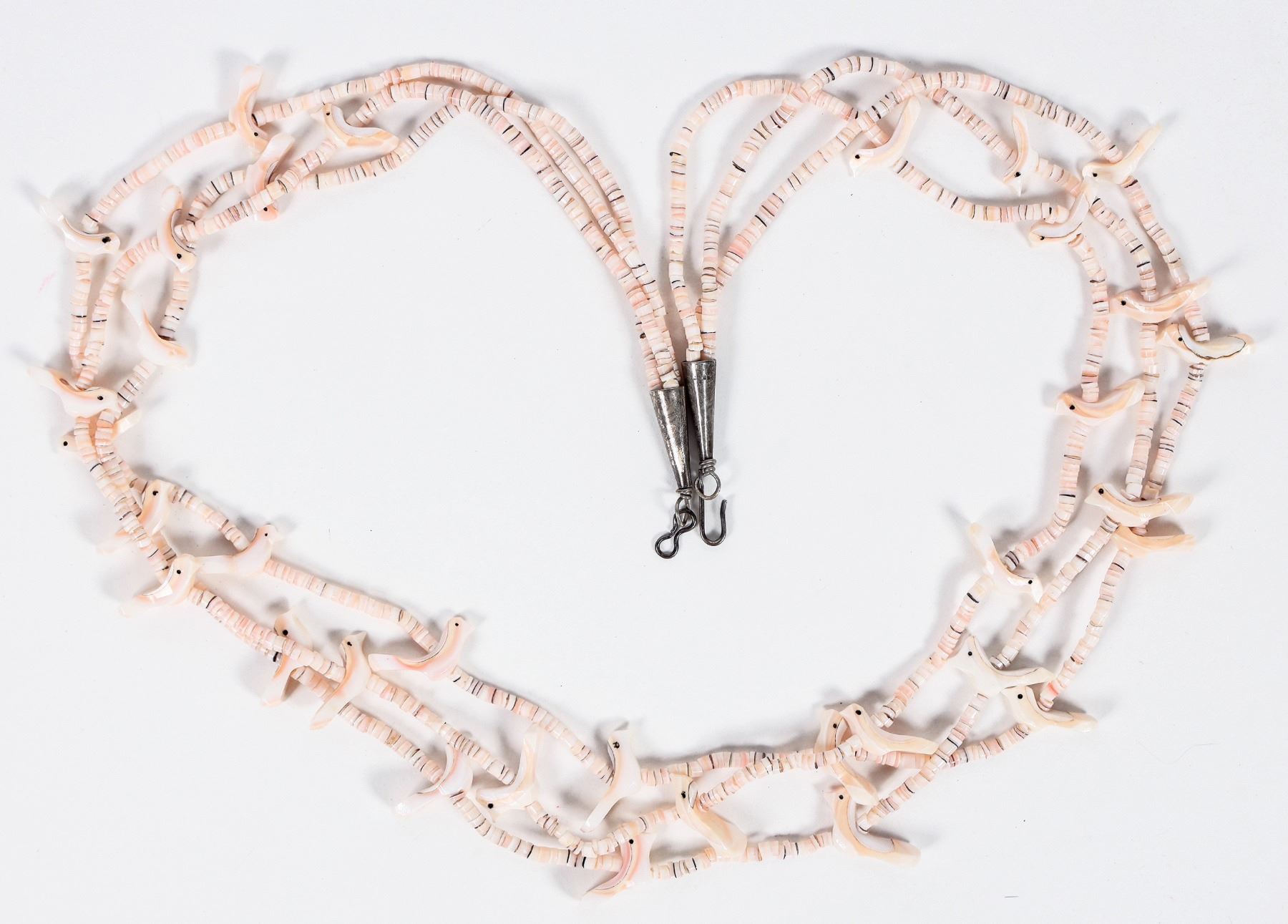 Hee-shi, also known as "Heishi" necklace. 3-strand necklace with small bird shaped beads. Necklace measures 24". Good condition, see photo.