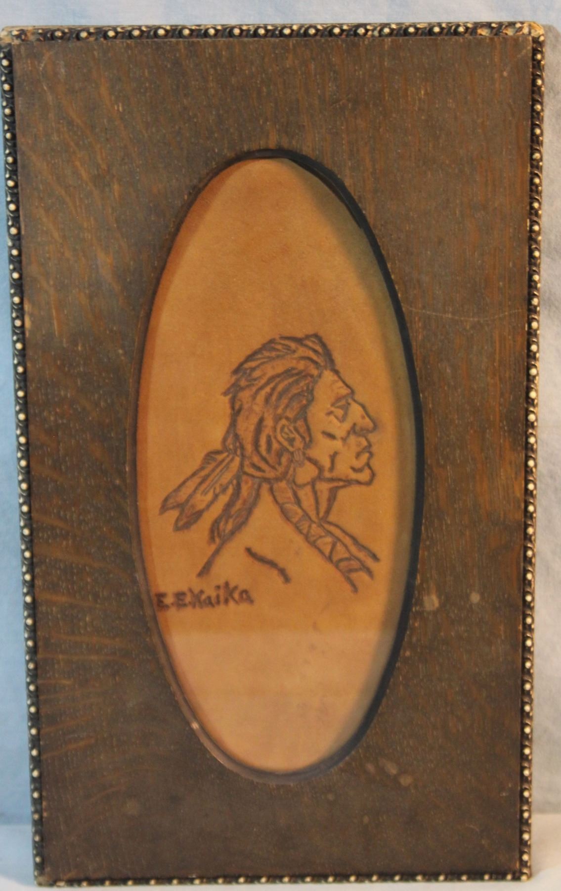 Heikka, E. E. leather carving, Indian Portrait, 10" x 5" oval w/original Heikka sketch on back