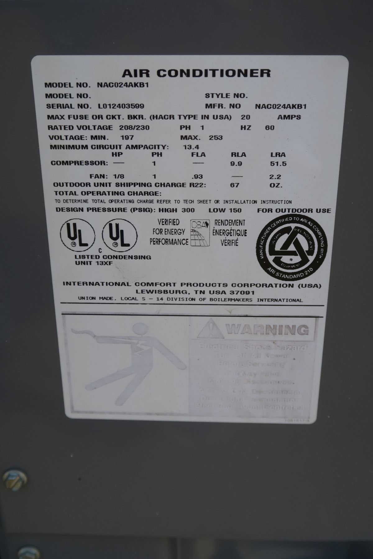 Heil 10 Central Air Conditioner, c/w Cooling Coil