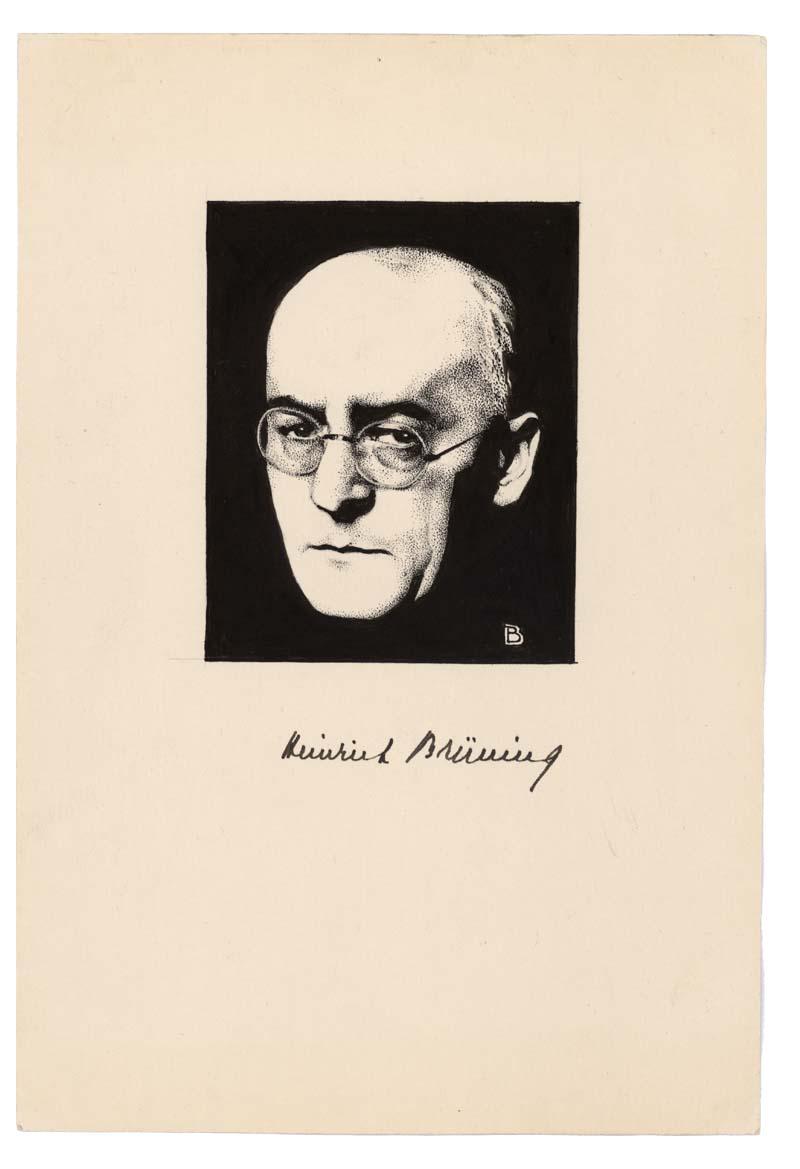 HEINRICH BRUNING (1885-1970) German politician during the Weimar Republic. Bruning served as Chancellor of Germany from 1930 to 1932.His Signature, ""Heinrich Bruning,"" below a pen and ink sketch of Bruning. 7"" x 10 3/8"" overall. Mounting trace on verso. Some very minor edge wear. Overall Very Fine.