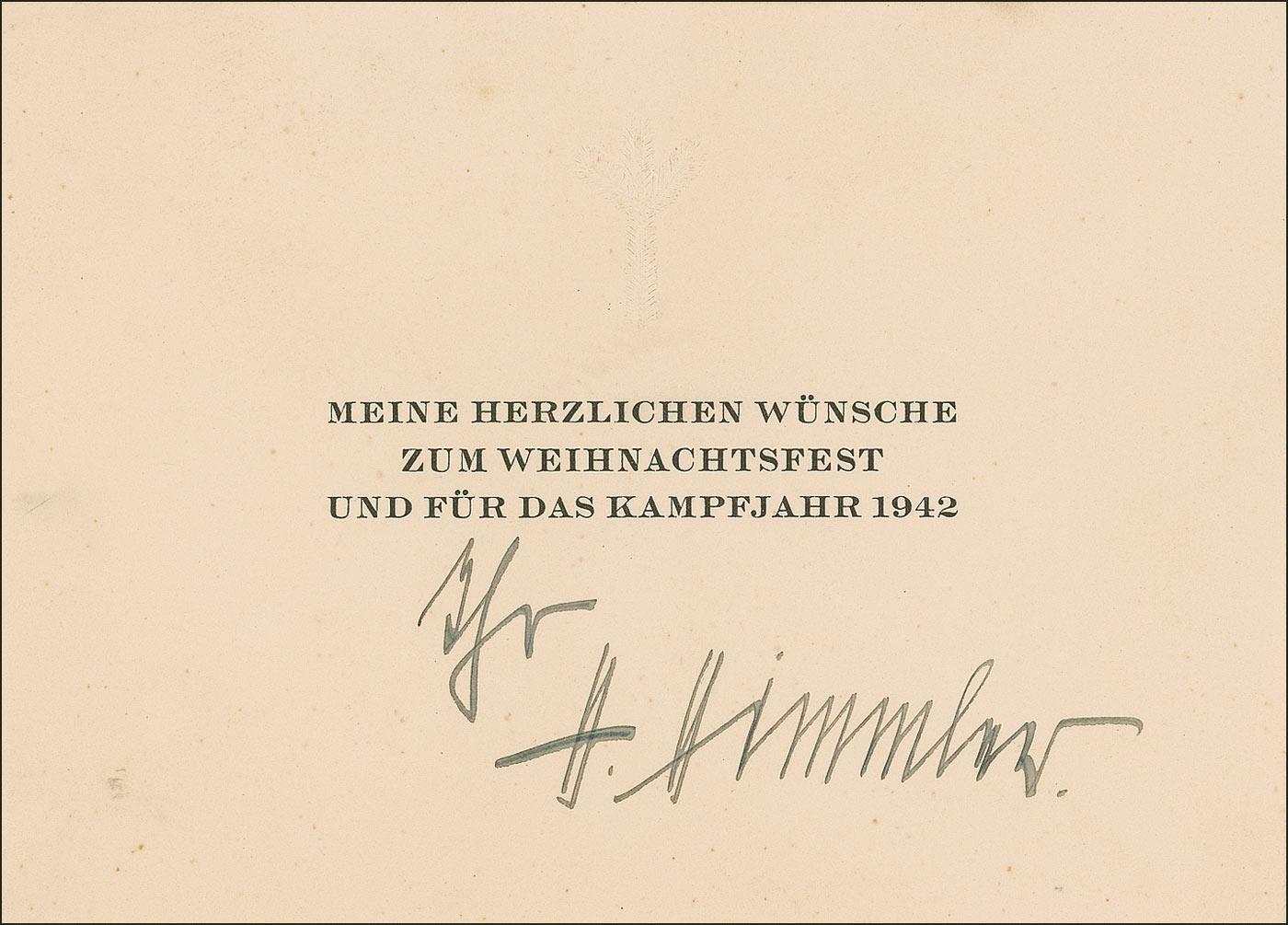 Nazi Reichsführer (1900–1945) who controlled the SS and the Gestapo and who was one of the most vocal and virulent anti-Semites of the Third Reich. He committed suicide with a cyanide capsule while awaiting trial at Nuremberg. Printed Christmas card, in German, 5.75 x 4.25, bearing a pre-printed sentiment for the holidays and new year in 1942, signed at the bottom in black ink, “H. Himmler.” In fine condition.