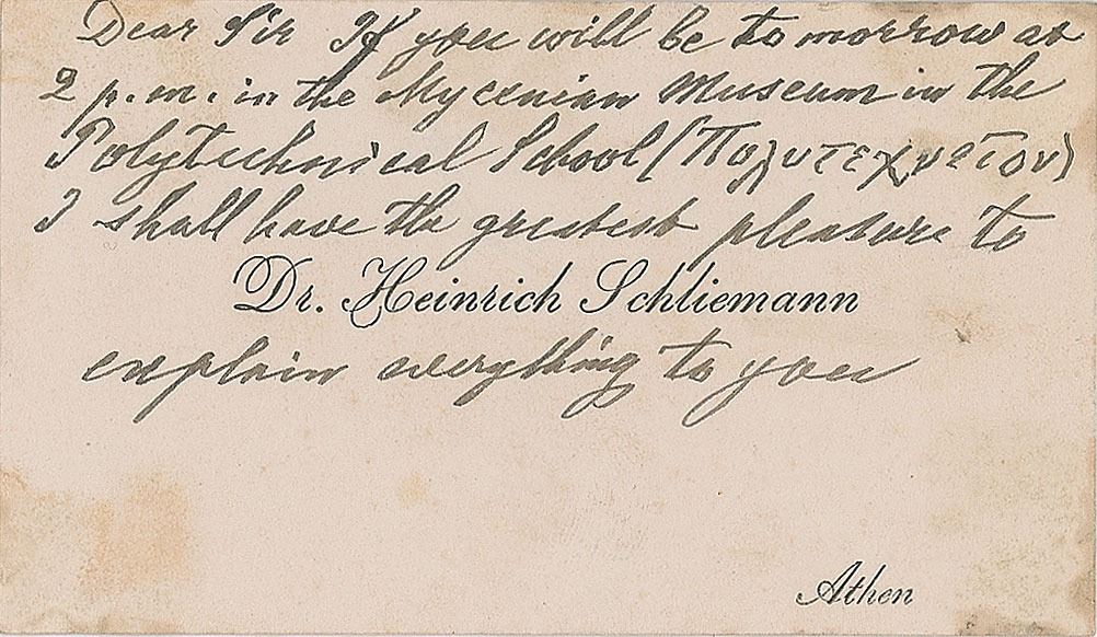 Pioneering archaeologist (1822–1890) best known for his excavations at the ancient sites of Troy and Mycenae. Unsigned handwritten note in ink by Heinrich Schliemann, penned on the front of his personal 3.75 x 2 calling card, which reads: "Dear Sir, If you will be tomorrow at 2 p.m. in the Mycenian Museum in the Polytechnical School…I shall have the greatest pleasure to explain everything to you." In very good to fine condition, with scattered light staining.