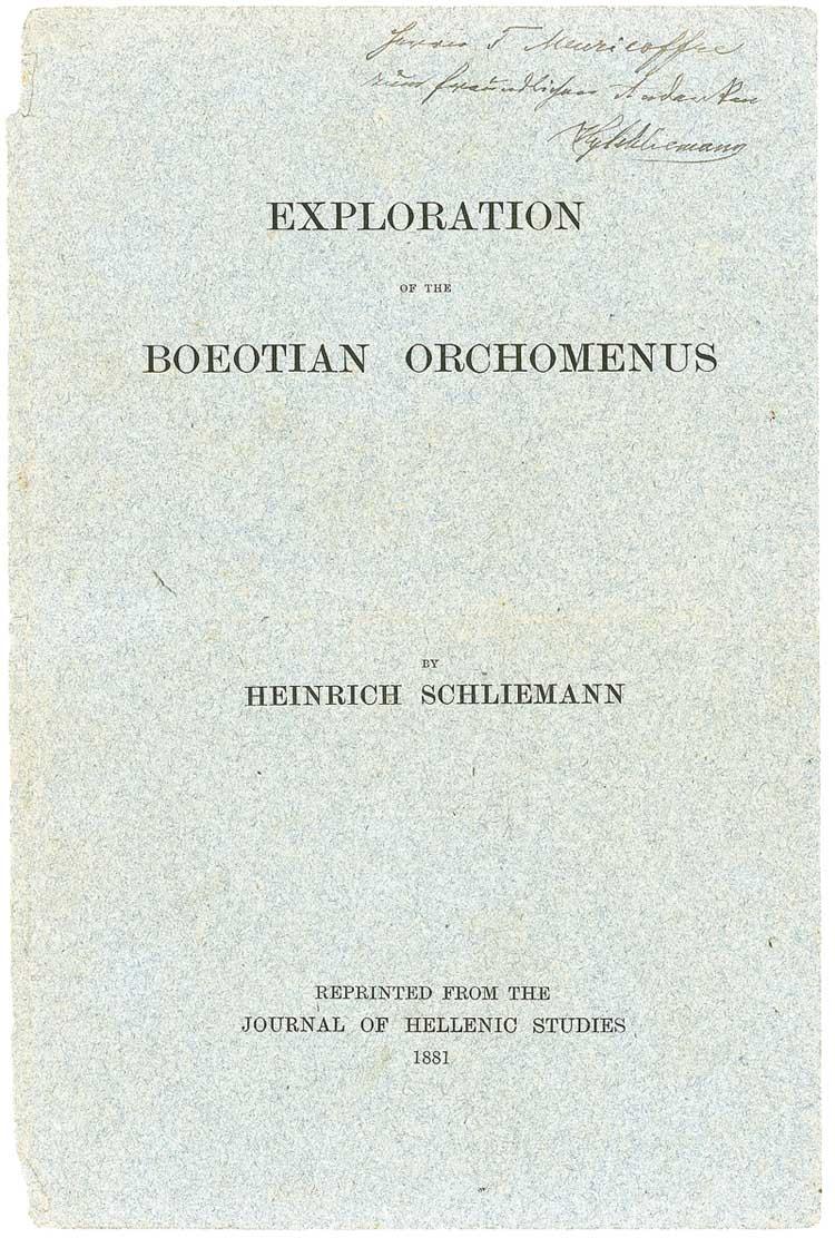 Pioneering archaeologist (1822–1890) best known for his excavations at the ancient sites of Troy and Mycenae. Cover (only) from a publication titled Exploration of the Boeotian Orchomenus, signed and inscribed, in German, at the top by Schliemann. A few creases, light edge wear, and mild toning, otherwise fine condition. RRAuction COA.